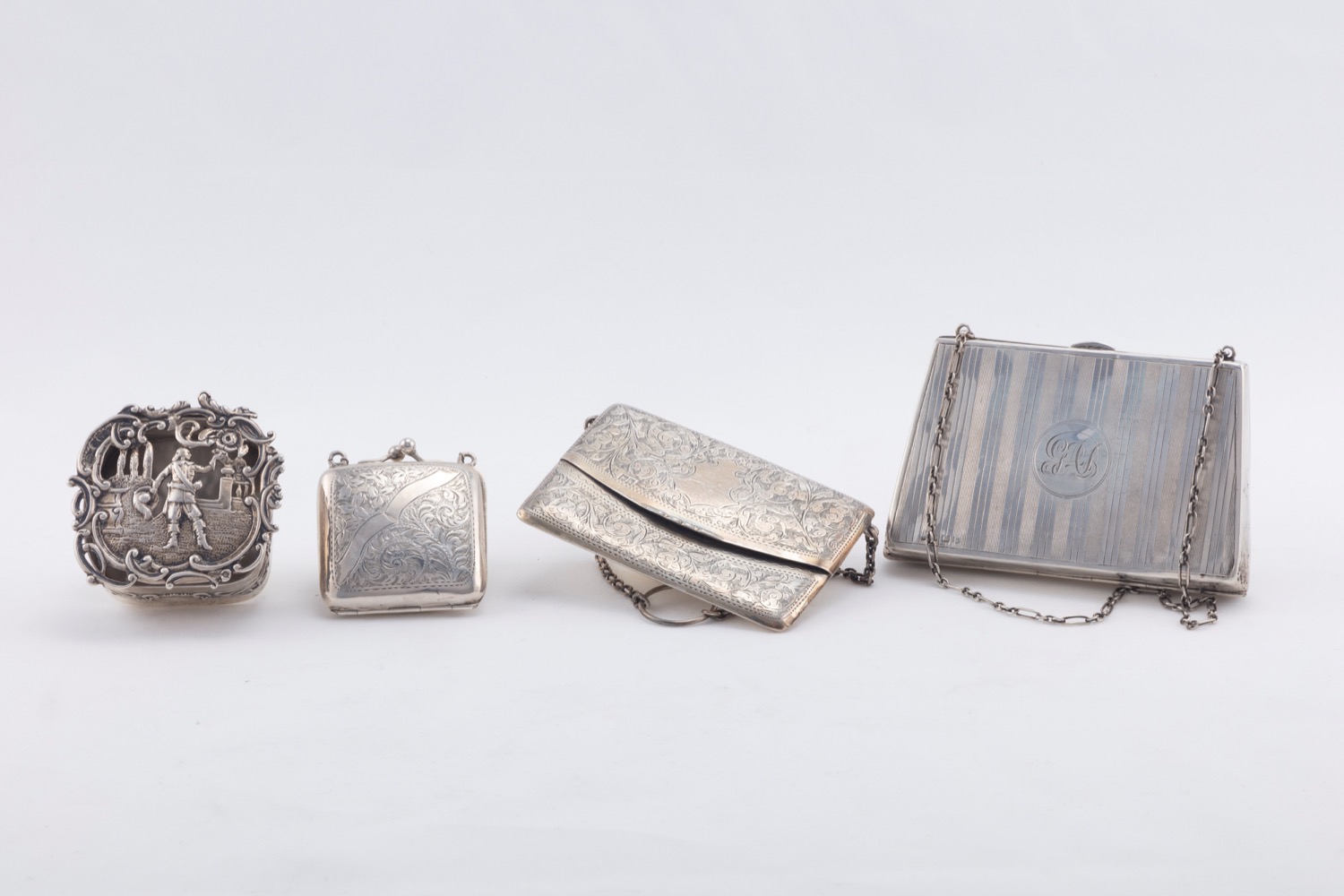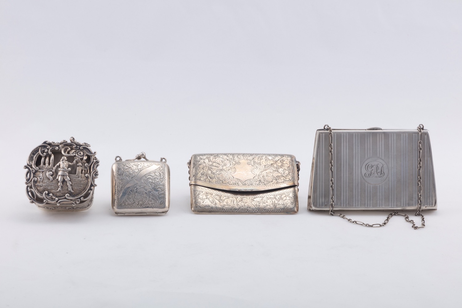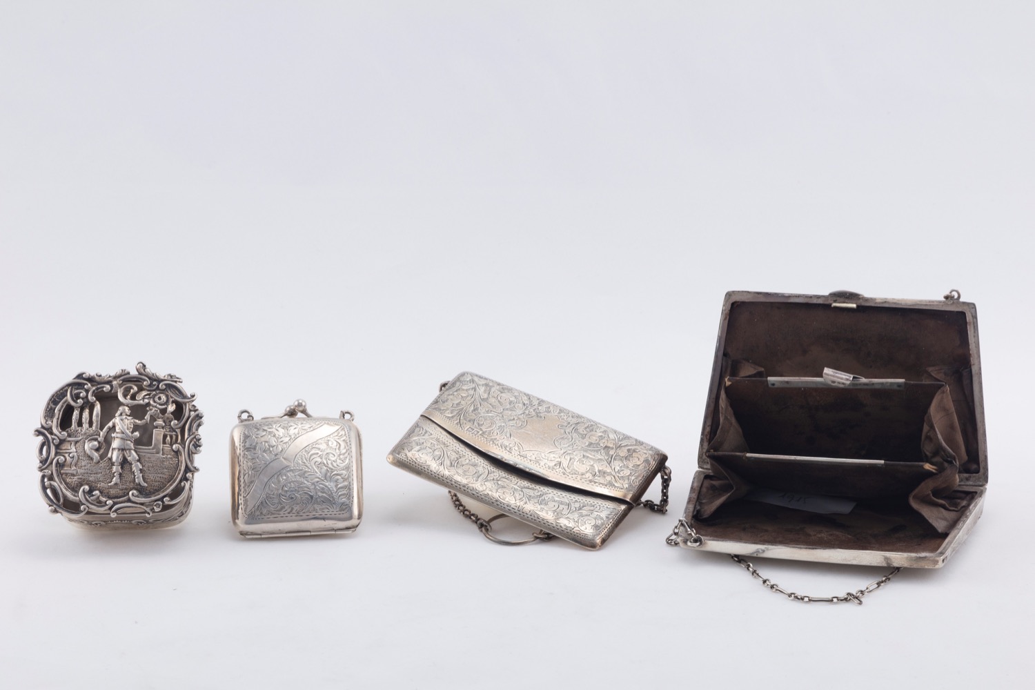 composto da un porta biglietti di forma rettangolare finemente inciso con decori fogliacei e stemma (l cm 10,50), un porta biglietti zigrinato centrato da monogramma (l cm 12,00), un portamonete inciso con decori floreali e fascia (l cm 5,50), una scatolina sbalzata con figura galante in giardino (l cm 6,50), difetti.