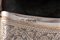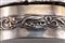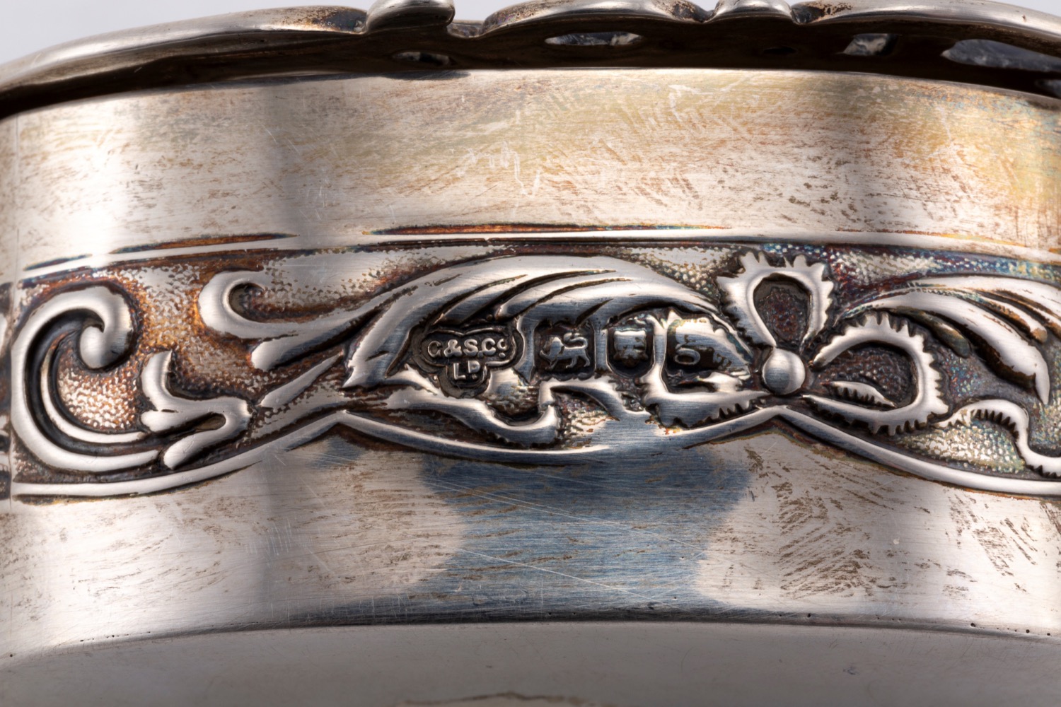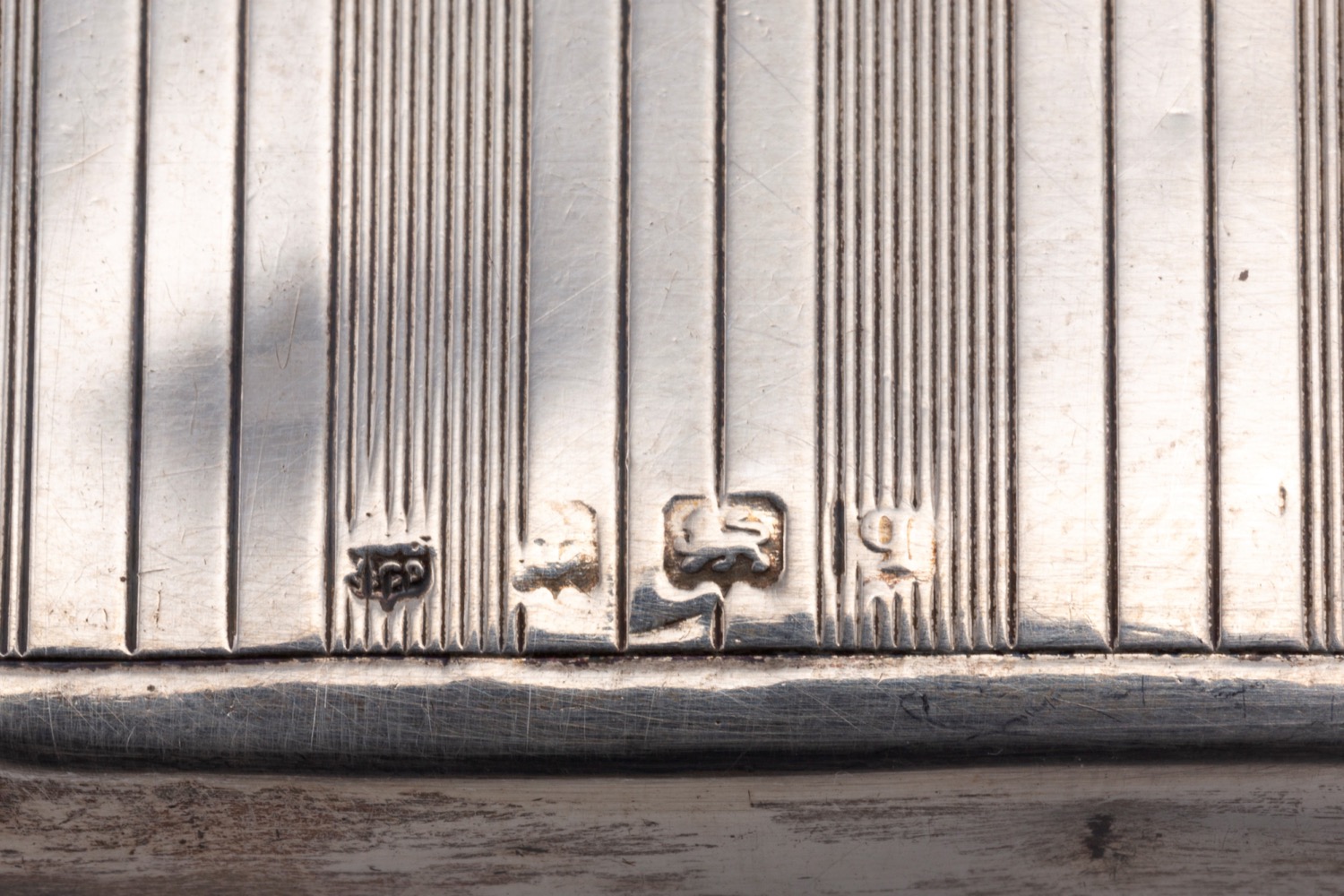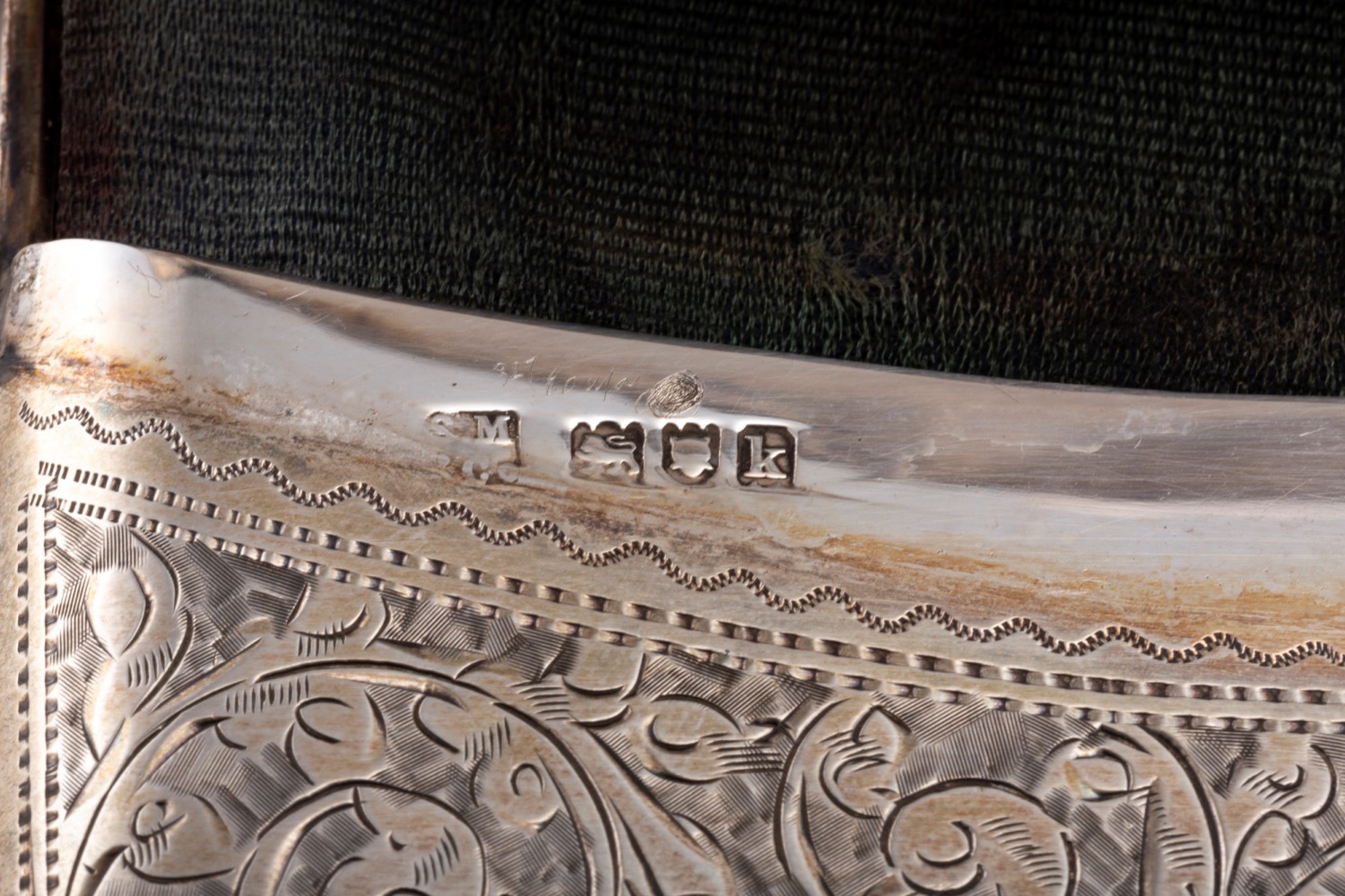 composto da un porta biglietti di forma rettangolare finemente inciso con decori fogliacei e stemma (l cm 10,50), un porta biglietti zigrinato centrato da monogramma (l cm 12,00), un portamonete inciso con decori floreali e fascia (l cm 5,50), una scatolina sbalzata con figura galante in giardino (l cm 6,50), difetti.