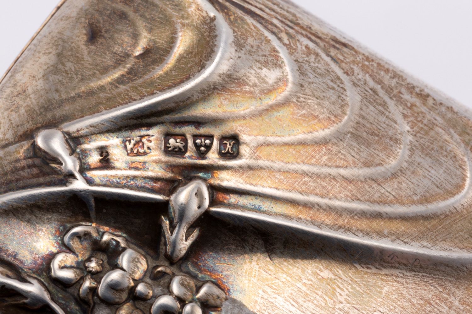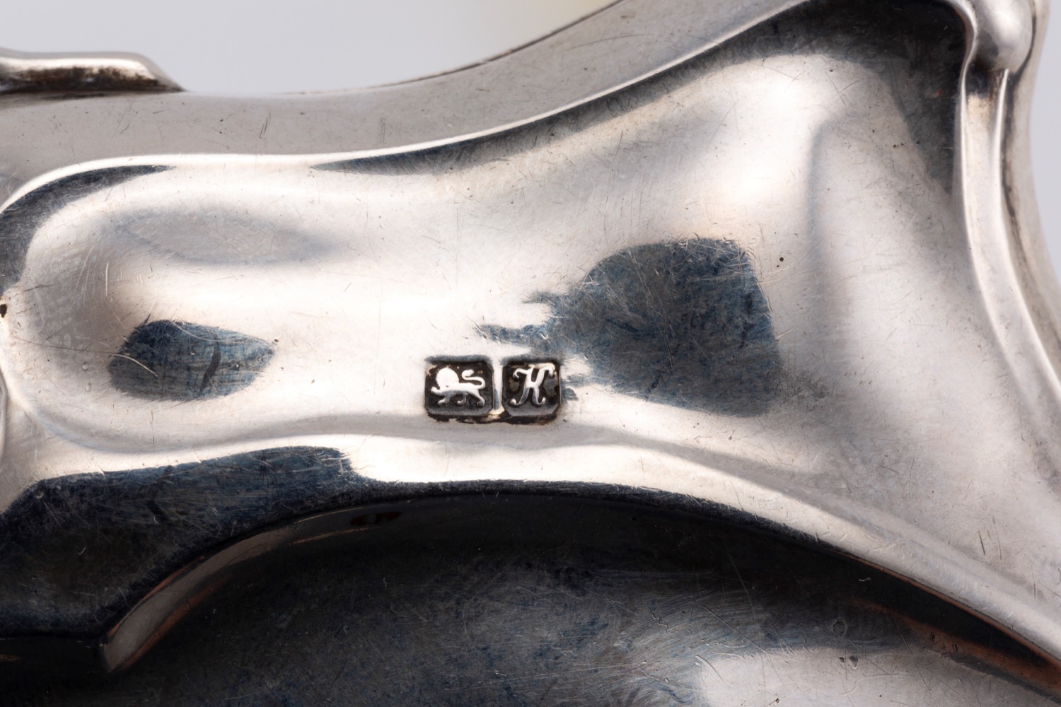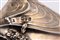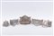 due a forma di borsetta con corpo liscio incisi al centro con ghirlanda e fiocco (l cm 12,00 e 8,50), uno sbalzato con motivi floreali (l cm 9,50), uno rettangolare zigrinato (l cm 12,00), uno a corpo liscio (l cm 7,00), difetti.