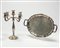 composto da un candelabro a cinque fiamme (h cm 37,00, con base appesantita) e vassoio biansato, liscio, a profilo mistilineo (cm 48,00x30,00).