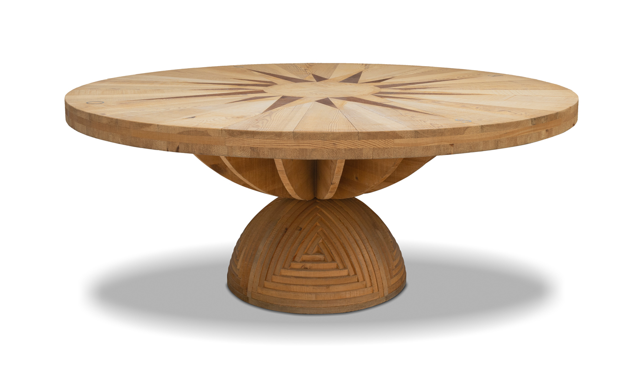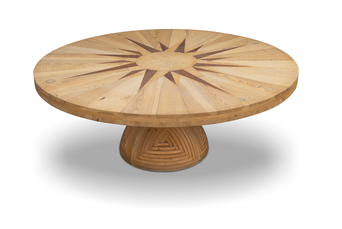 Tavolo in legno di pino di Russia con piano intarsiato e applicazioni in bronzo