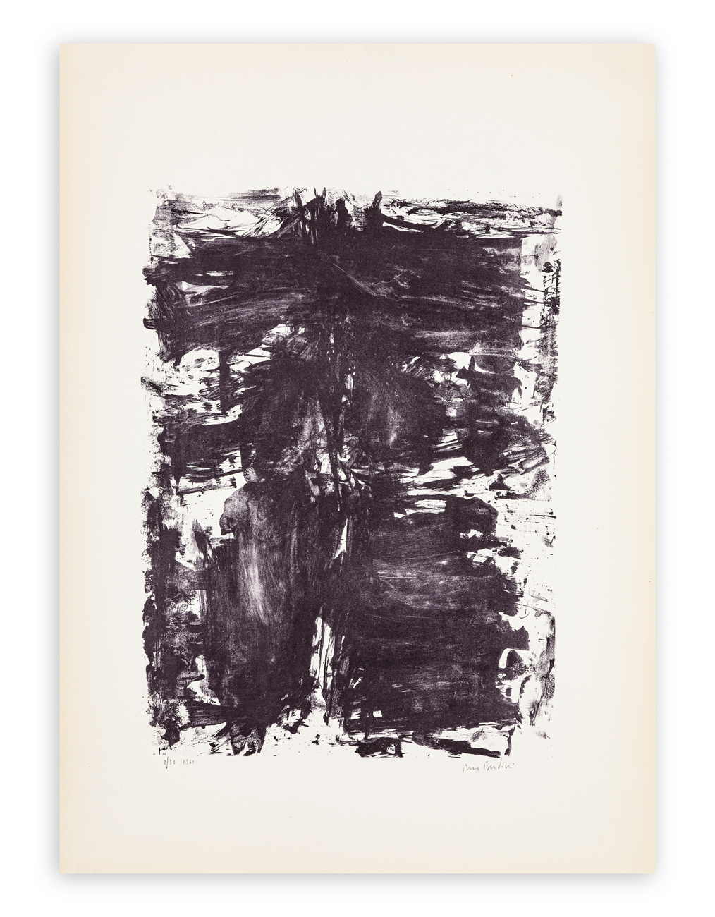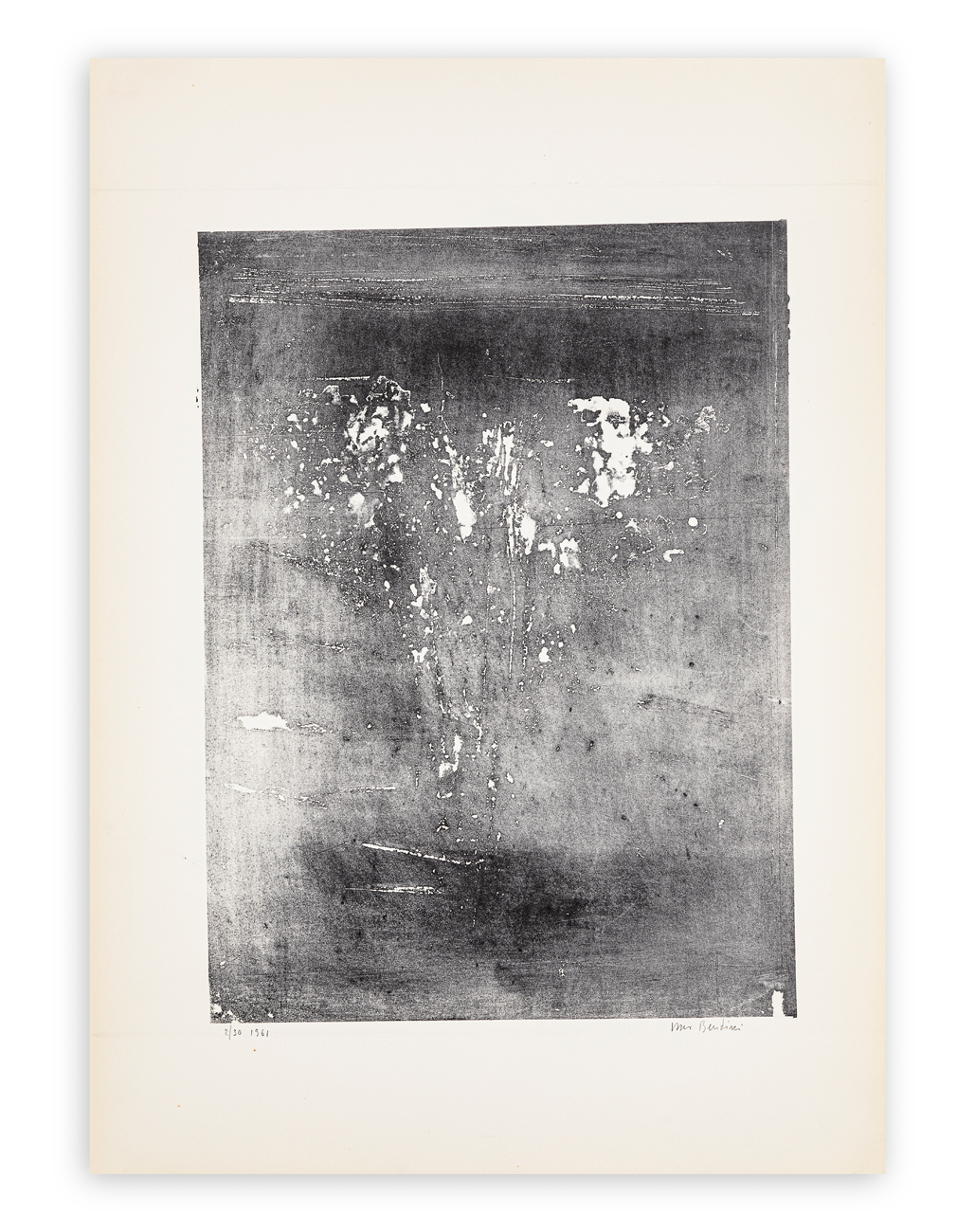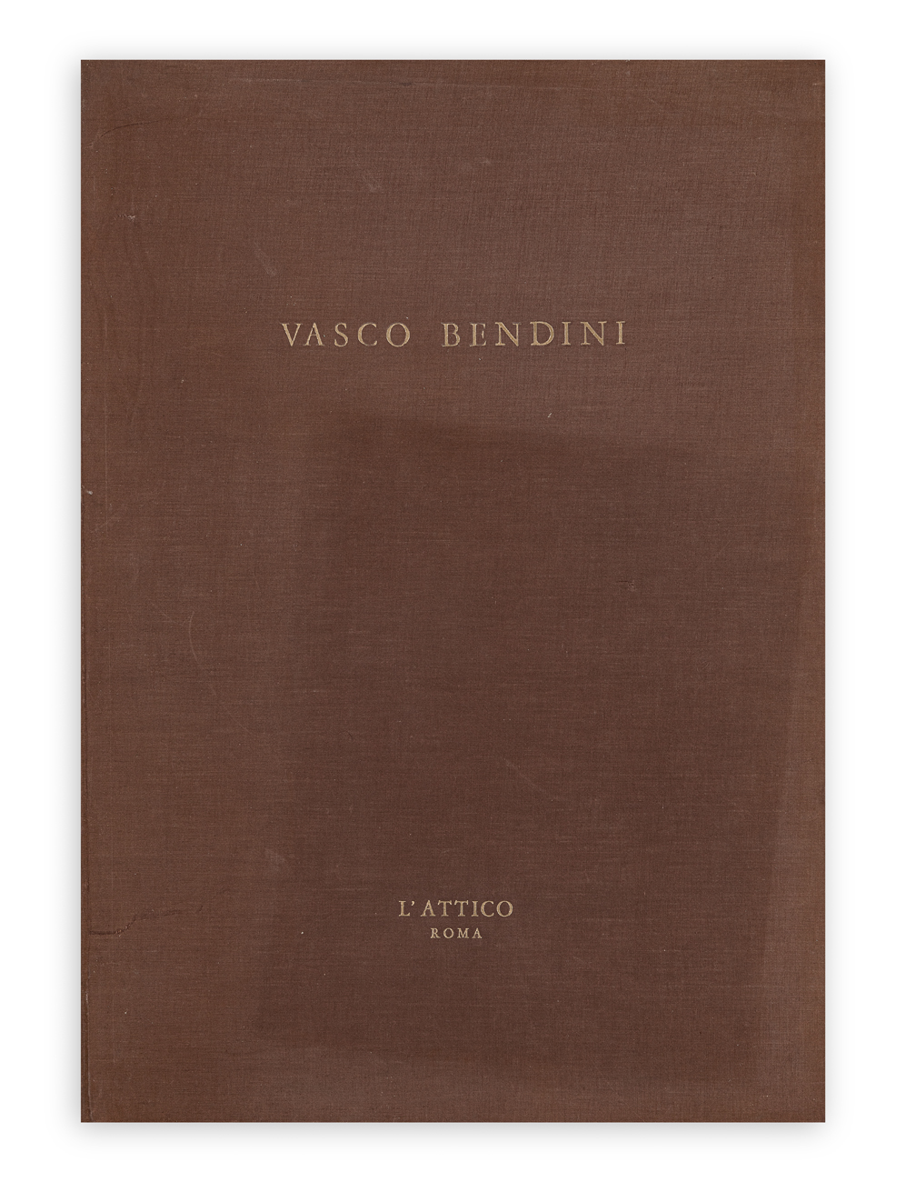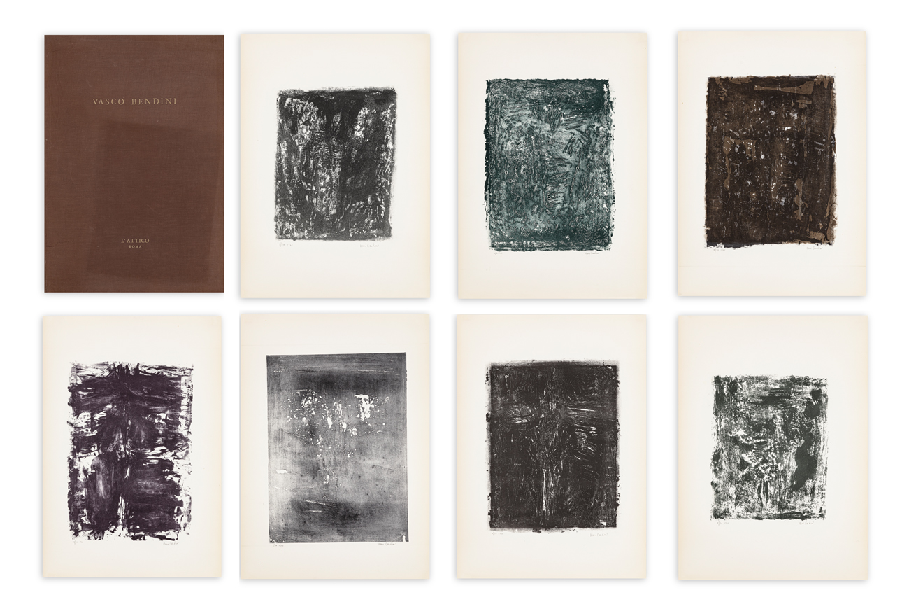Splendida cartella contenente testo di presentazione di Francesco Arcangeli e sette litografie di Vasco Bendini, ciascuna recante firma, datazione e numerazione (Esemplari 2/30) a matita al fronte; una delle sette litografie presenta numerazione più limitata (Esemplare 2/6) come specificato nel colophon