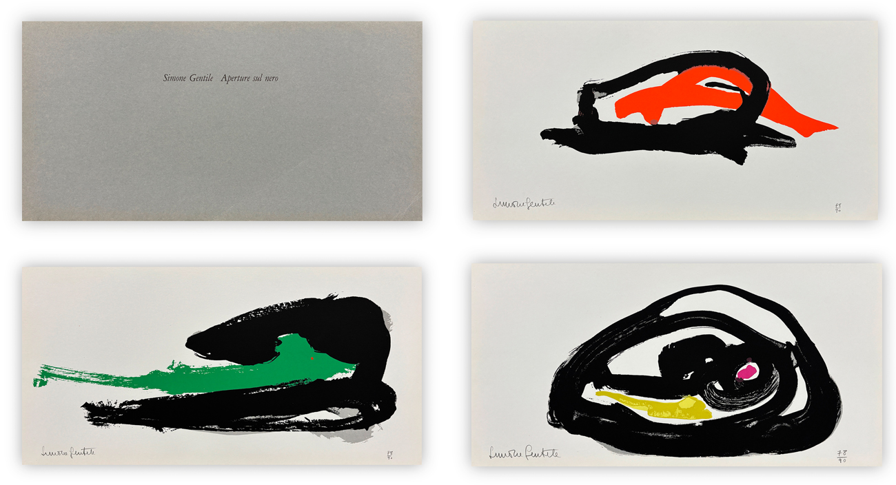 Cartella contenente presentazione di Luigi Cavallo e 3 serigrafie sciolte di Simone Gentile, ciascuna recante firma e numerazione (Esemplari 78/90) a matita al fronte