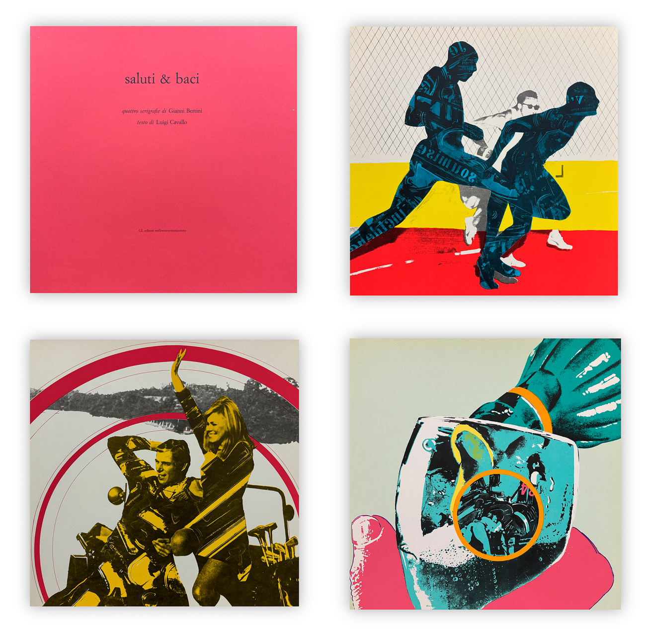 Cartella contenente 4 doppi fogli sciolti con testi di Luigi Cavallo e 4 lito-serigrafie di Gianni Bertini, ciascuna recante firma e numerazione (Esemplari 21/120) a matita al retro
