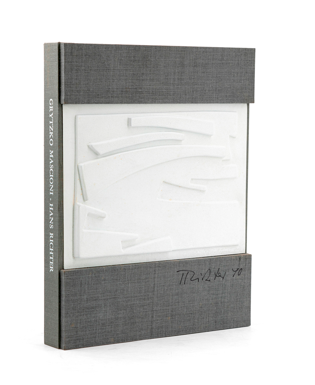 Astuccio telato con multiplo in plastica di Hans Richter recante firma e datazione a pennarello al fronte, contenente al suo interno 6 poesie di Grytzko Mascioni e 6 acqueforti di Hans Richter