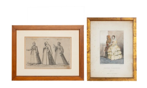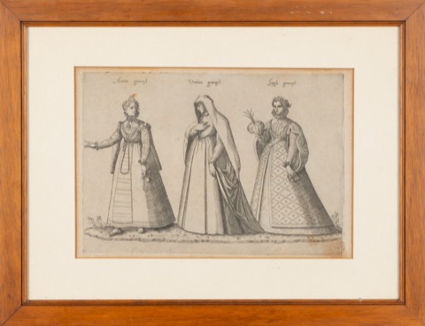 Lotto comprendente un'elegante raffigurazione di tre donne genovesi in abiti da cerimonia, sec XVI; seguono altre stampe raffiguranti personaggi genovesi in abiti tipici. Lotto comprendente un'elegante raffigurazione di tre donne genovesi in abiti da cerimonia, sec XVI; seguono altre stampe raffiguranti personaggi genovesi in abiti tipici.