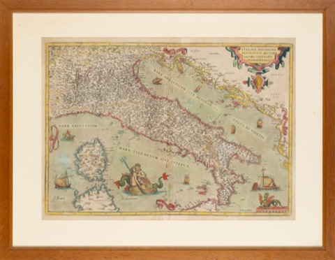 Carta generale dell'Italia basata sul lavoro di Giacomo Gastaldi. Rispetto al modello, Ortelius inserì degli elementi decorativi e ornamentali tra cui la sfinge seduta sulla scala grafica in basso a destra. Esemplare tratto dall'edizione latina del 1592 Theatrum Orbis Terrarum, considerato il primo vero atlante moderno. Acquaforte in bella coloritura coeva. Carta generale dell'Italia basata sul lavoro di Giacomo Gastaldi. Rispetto al modello, Ortelius inserì degli elementi decorativi e ornamentali tra cui la sfinge seduta sulla scala grafica in basso a destra. Esemplare tratto dall'edizione latina del 1592 Theatrum Orbis Terrarum, considerato il primo vero atlante moderno. Acquaforte in bella coloritura coeva.