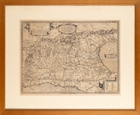 Carta della Gallia Cisalpina, tratta dal Parergon Theatri Orbis Terrarum. Oltre al titolo, in alto a sinistra è presente la dedica a Francesco Soranzo, al centro un cartiglio con sei righe di toponimi di incerta localizzazione e in basso altro cartiglio con due colonne di popoli di dubbia provenienza.