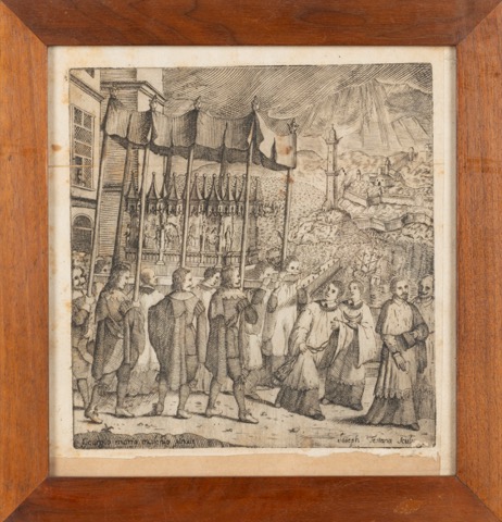 Altra incisione analoga; insieme nel lotto un ritratto di Ortelio, una raffigurazione di donna genovese che vende fiori e una scena di processione.