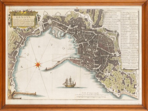 Importante pianta di Genova preparata da Giacomo Brusco e incisa da G. L. Guidotti. Pianta della città di Genova entro le mura trecentesche, presenti settantasette rimandi di edifici rilevanti. Importante pianta di Genova preparata da Giacomo Brusco e incisa da G. L. Guidotti. Pianta della città di Genova entro le mura trecentesche, presenti settantasette rimandi di edifici rilevanti.