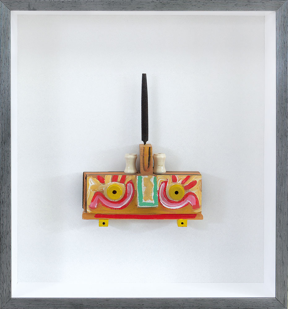 legni, acrilici e collage cm. 36x26x10, firma al retro (opera fissata alla teca in legno di cm. 64x59x11,5).