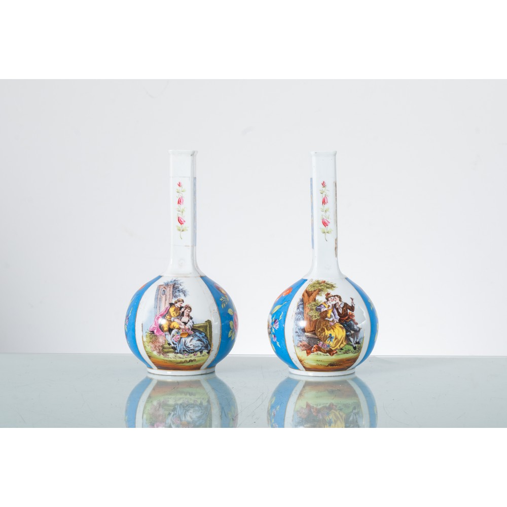 Coppia di vasi in porcellana decorata e dipinta a motivo floreale e fogliaceo raffiguranti "Scene galanti".