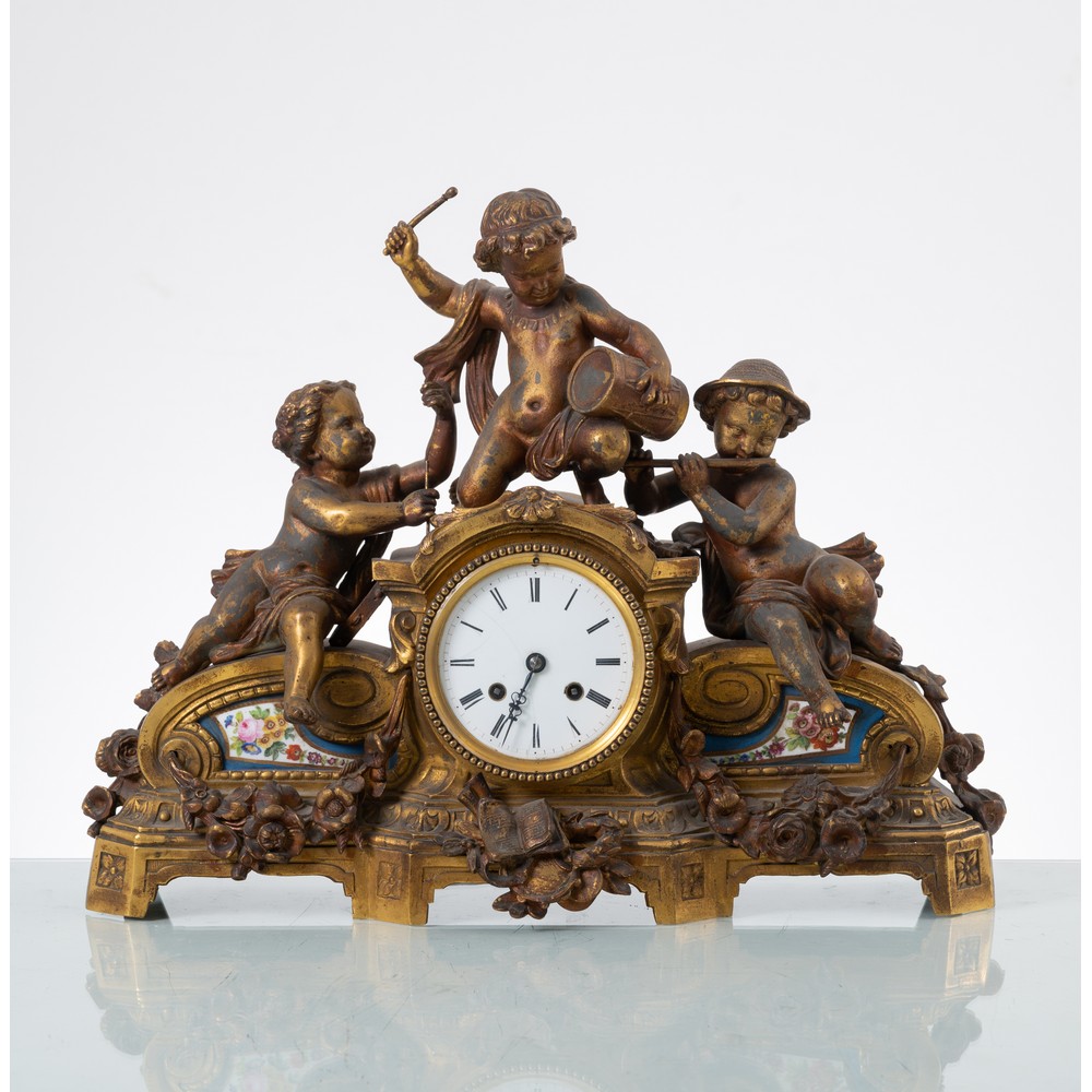 Orologio da tavolo in antimonio dorato con putti musici nella parte superiore e ghirlande nella parte inferiore, placche in porcellana di Sevres dipinte a mano.