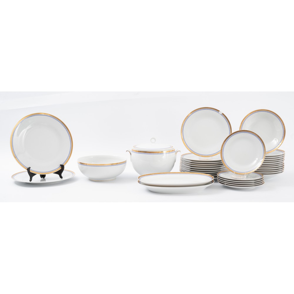 Servizio di piatti in porcellana bianca con bordure in oro composto da: 2 piatti da portata ovali, 2 piatti da portata tondi, insalatiera, zuppiera, 11 piatti piani, 12 piatti fondi e 6 piattini.