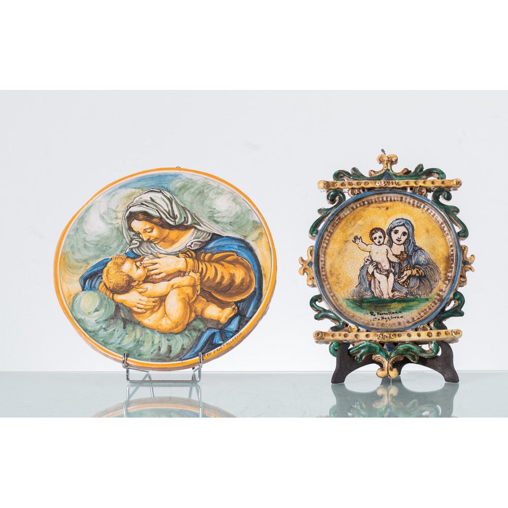 Tondo in terracotta decorata e dipinta raffigurante "Maternità" firmata Tre Erre Palermo e placca in terracotta decorata e dipinta raffigurante "Madonna con Bambino".