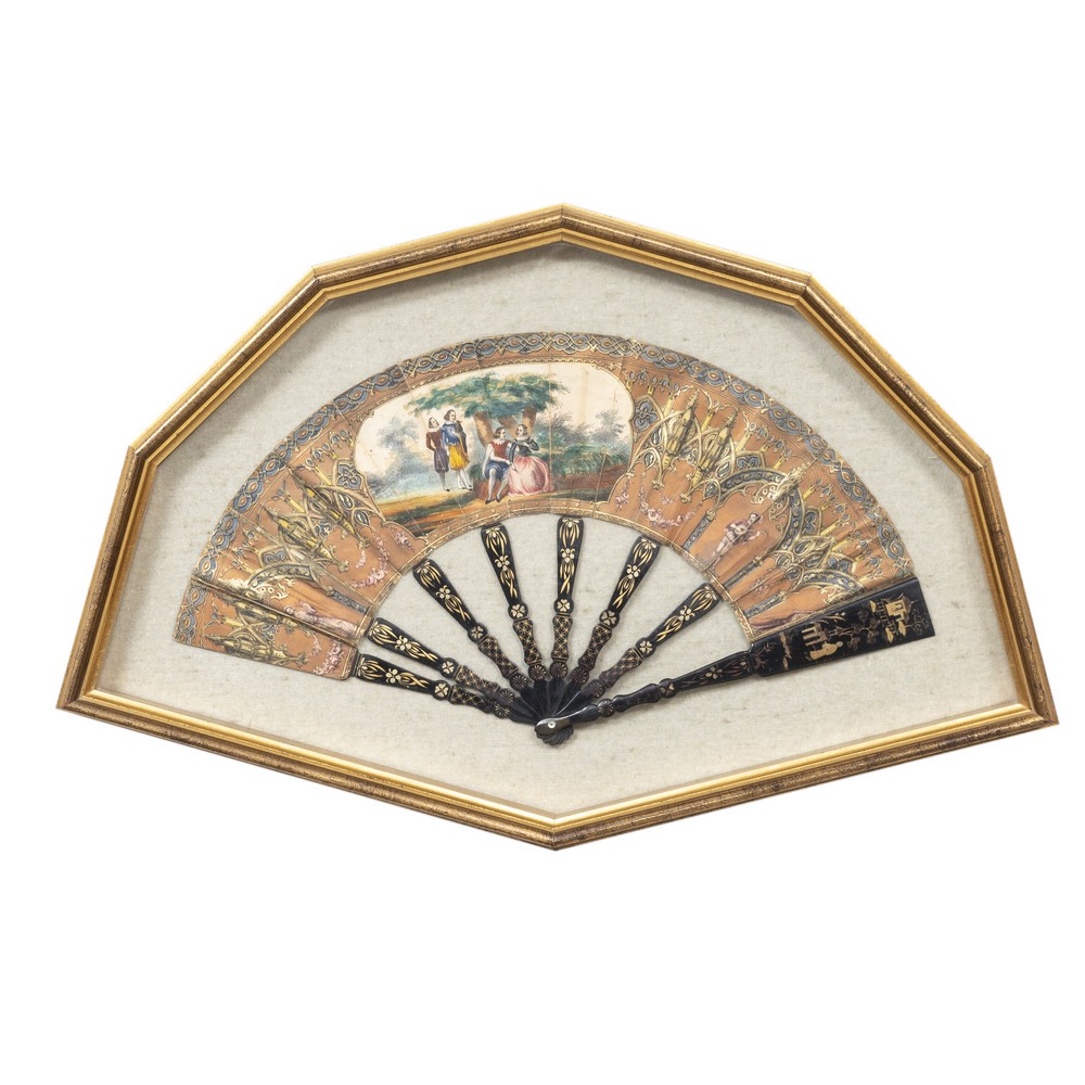 Ventaglio entro ventagliera con pagina dipinta a mano raffigurante scena galante e ventaglio entro ventagliera con stecche in legno lavorato, pagina in carta dipinta a mano raffigurante scena galante e disegni neogotici.