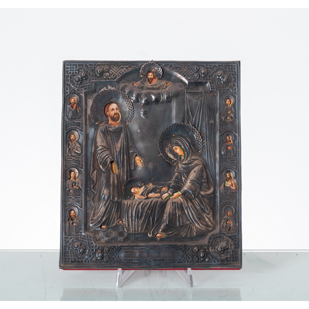 Icona in legno dipinto con riza in argento raffigurante "Sacra Famiglia con Santi".