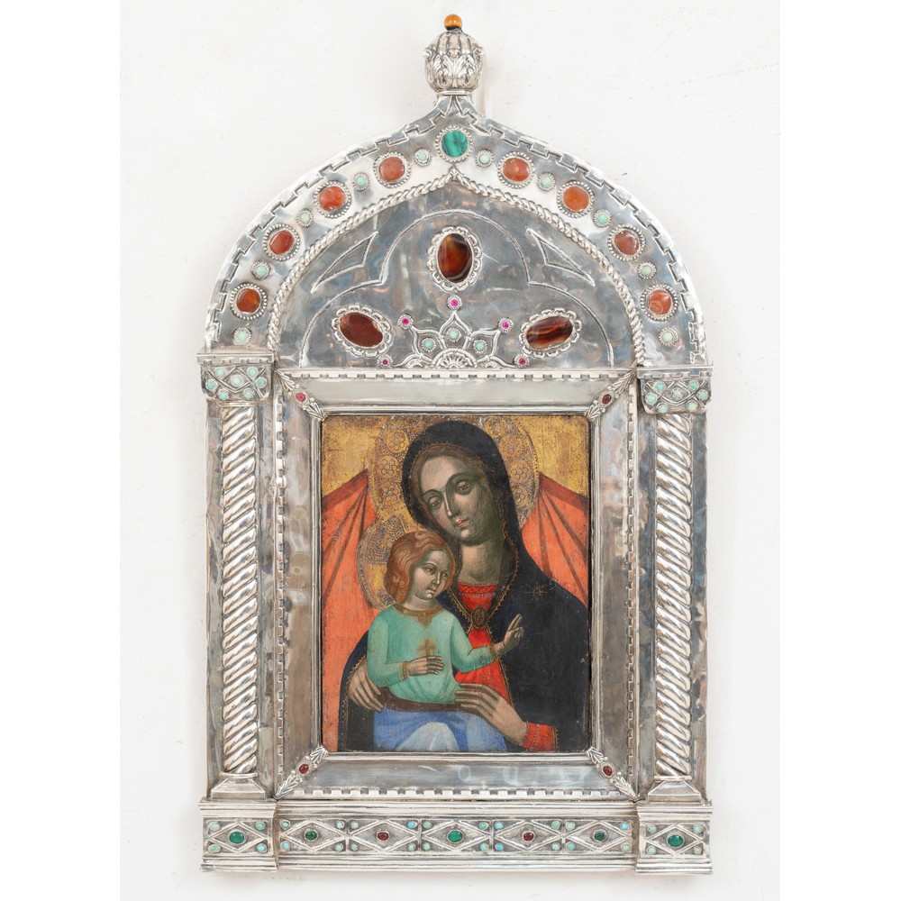 Icona dipinta a mano raffigurante "Madonna con Bambino" entro cornice in argento con pietre semipreziose.