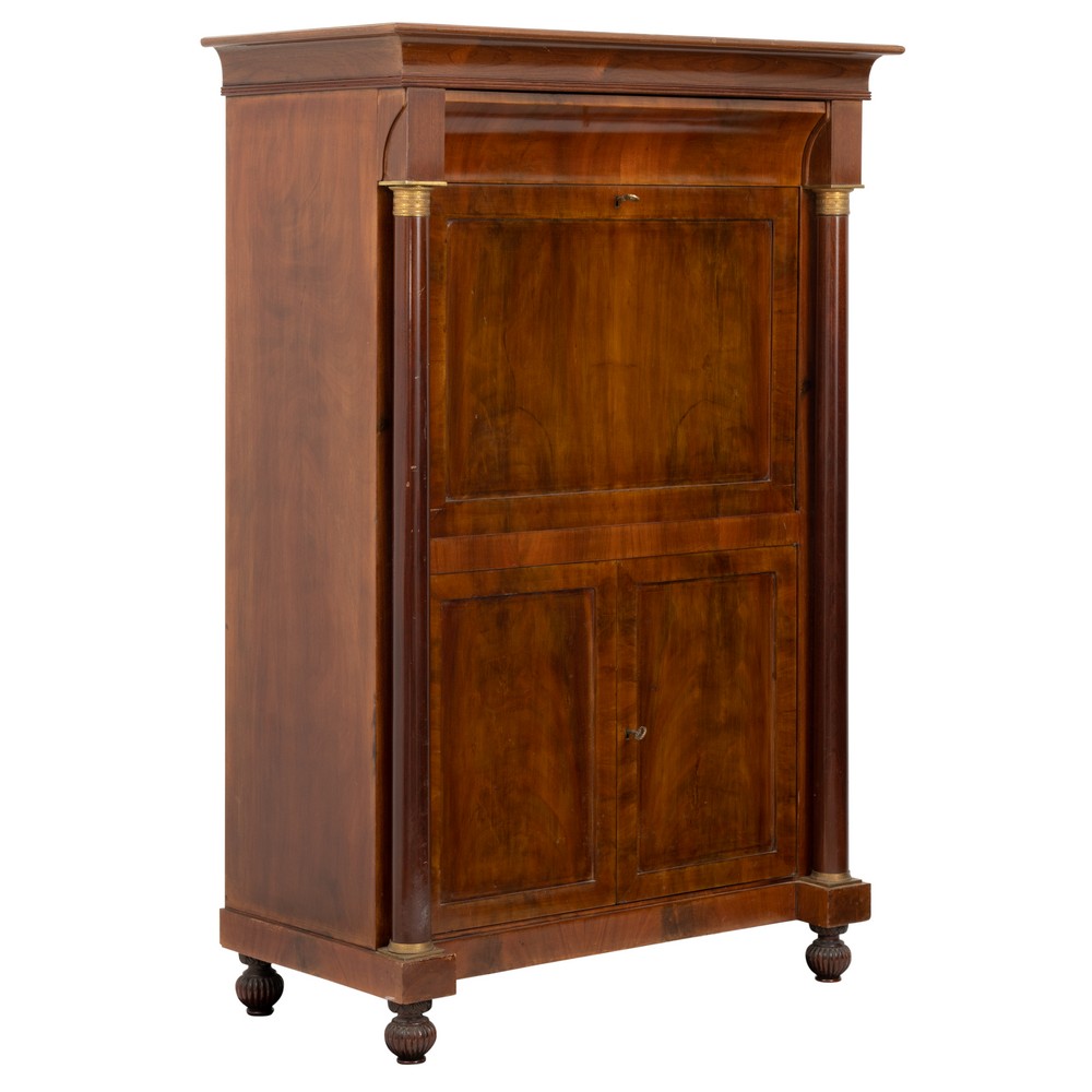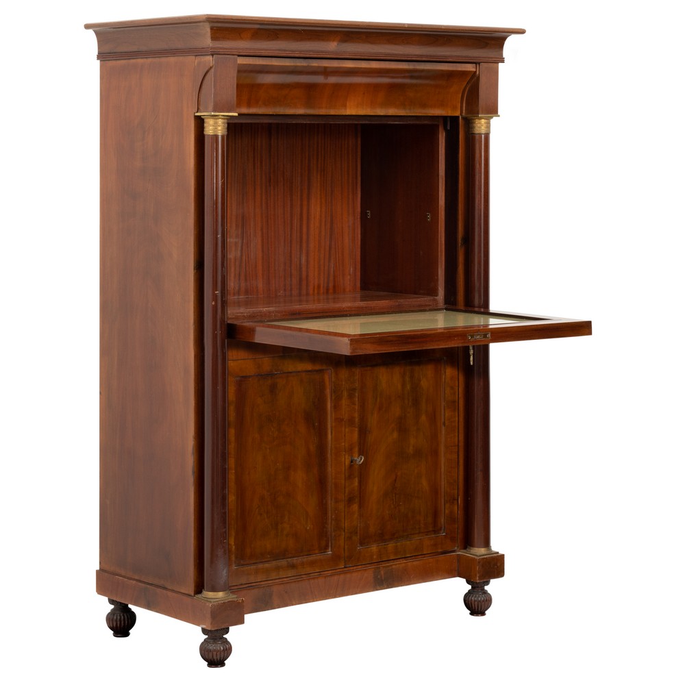 Secretaire stile Impero in legno di mogano e piuma di mogano, guarniture in bronzo dorato, piano in marmo incassato.