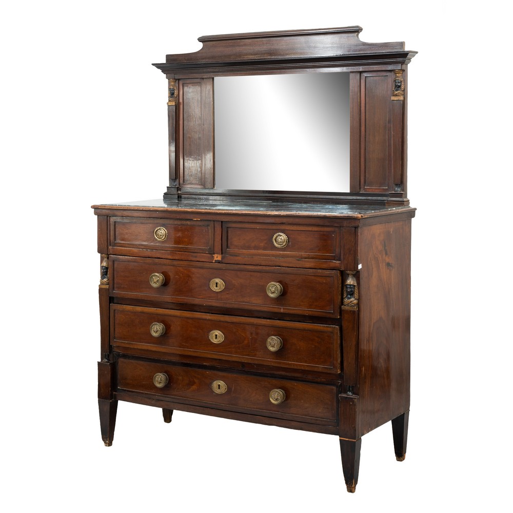 Cassettone con specchiera Impero in mogano con tre cassetti e due piccoli cassetti, fregi in legno raffiguranti "Sfingi", maniglie in ottone, piano in marmo verde delle alpi incassato (il marmo presenta mancanze e rotture).