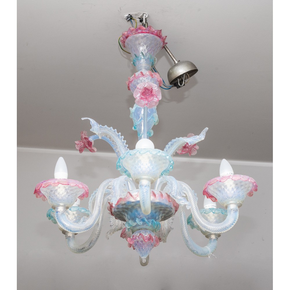 Lampadario a sei luci in vetro di murano nei toni del bianco con fiori colorati (usure e mancanze).