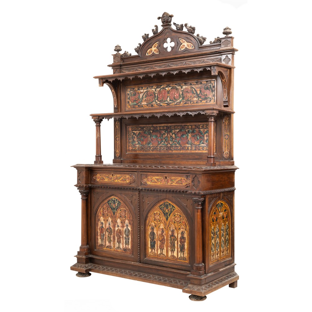Piattaia di gusto neogotico in legno di noce con pannelli in cuoio dipinto.