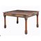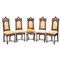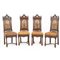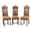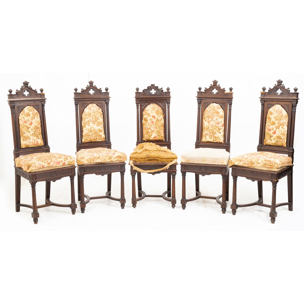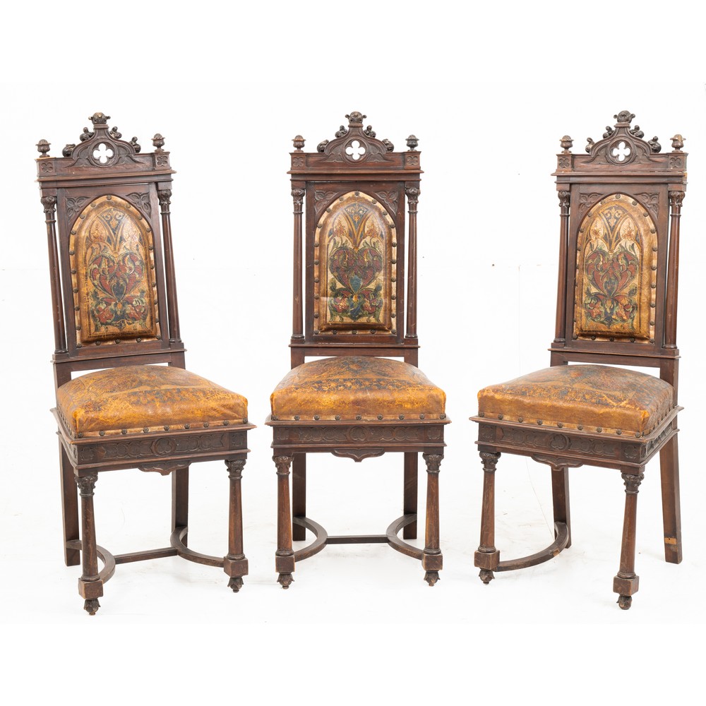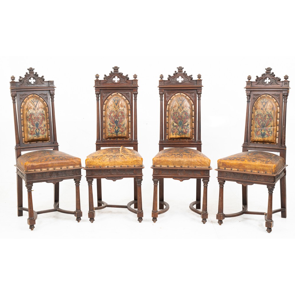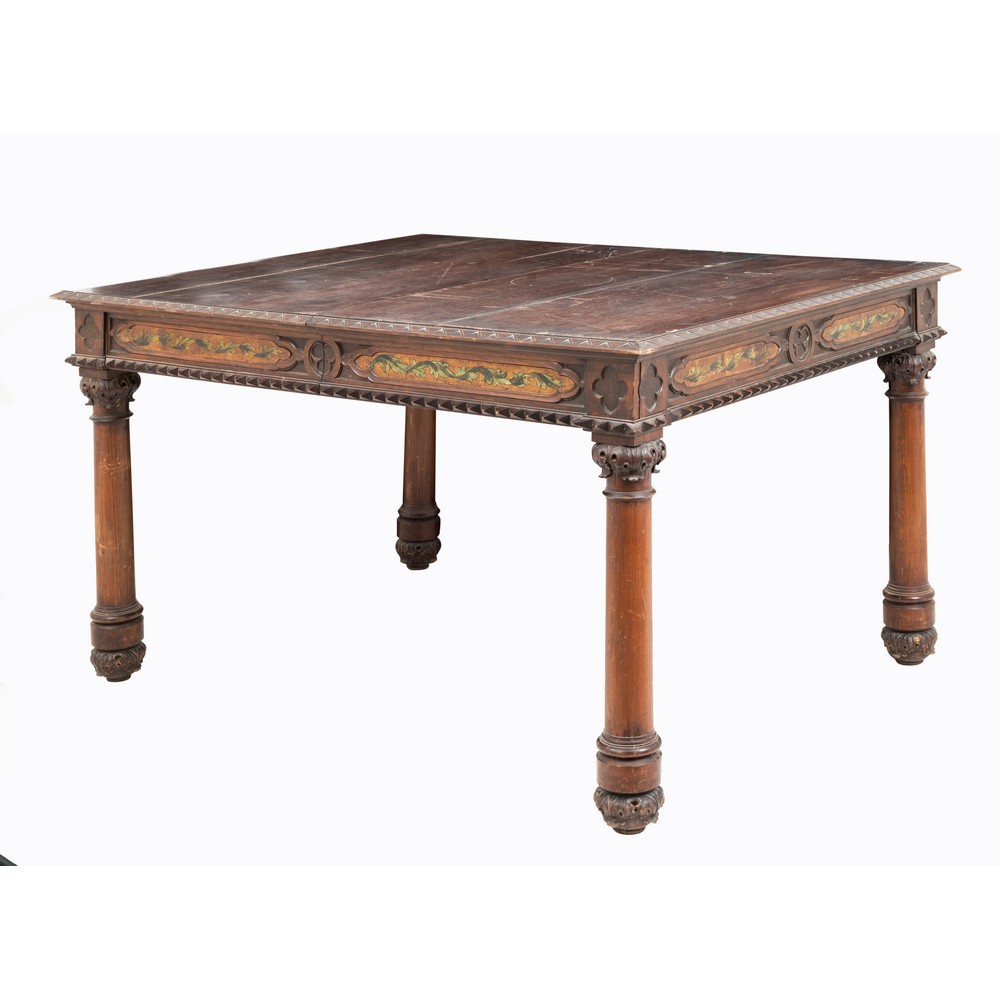 Tavolo e dodici sedie di gusto neogotico in legno di noce con tappezzeria in cuoio dipinto (cinque allunghi) (cinque sedie con cuoio mancante).