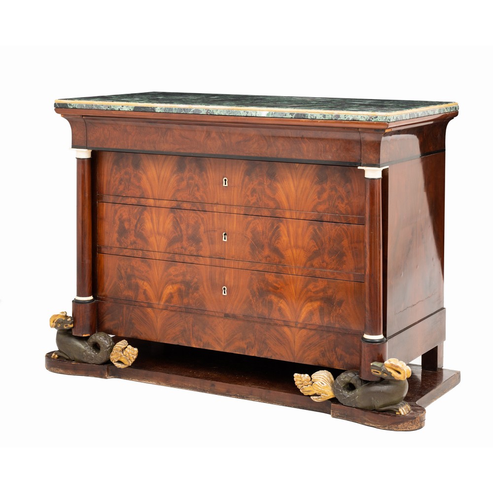 Cassettone a quattro cassetti in legno di mogano e piuma di mogano con piedi in legno laccato e dorato raffiguranti "Animali mitologici", periodo Isabellino.