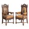 Coppia di poltrone di gusto neogotico in legno di noce con seduta e spalliera in cuoio dipinto.