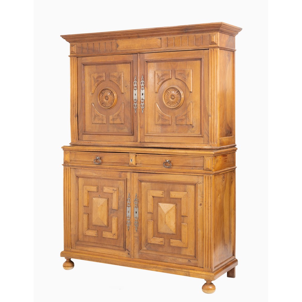 Credenza con alzata Enrico II con quattro porte e due cassetti in legno di noce.