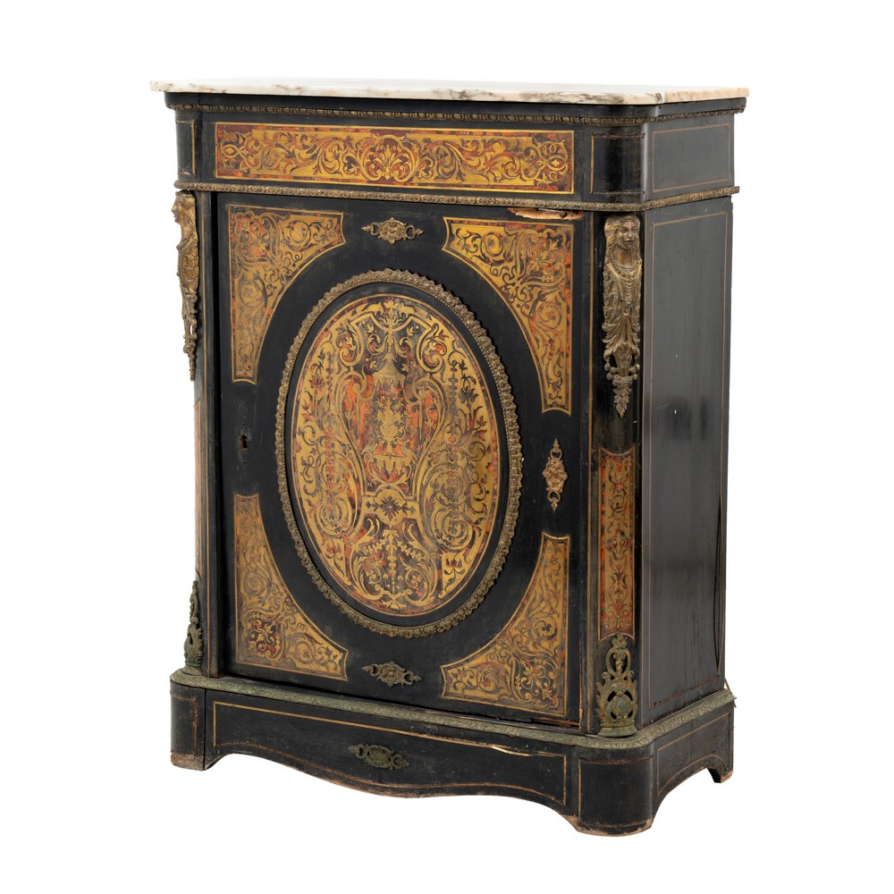 Credenza ad un'anta in legno ebanizzato con tarsie in rame ed applicazioni in bronzo dorato, piano in marmo bianco venato.