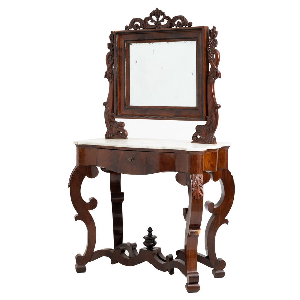 Toletta Luigi Filippo in legno di mogano e piuma di mogano, piano in marmo bianco (usure e mancanze).