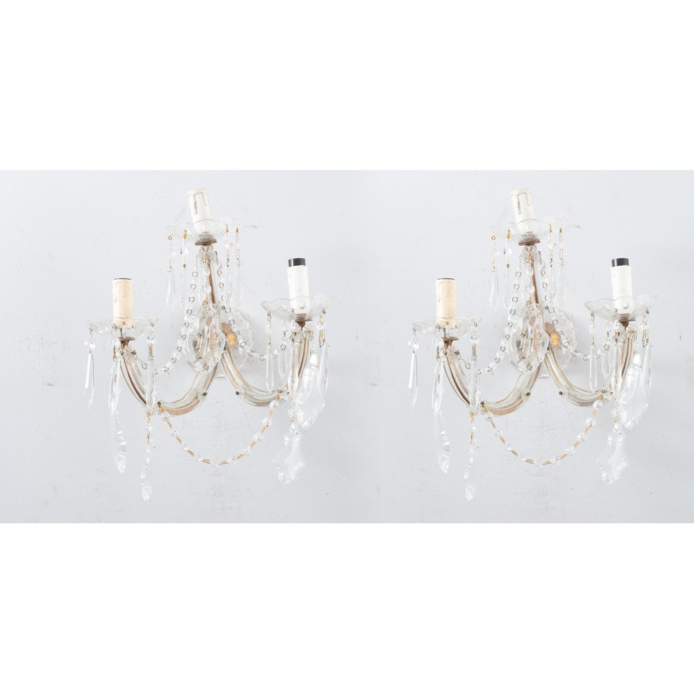 Coppia di applique Maria Teresa e tre luci in vetro e pendenti con struttura in ferro.