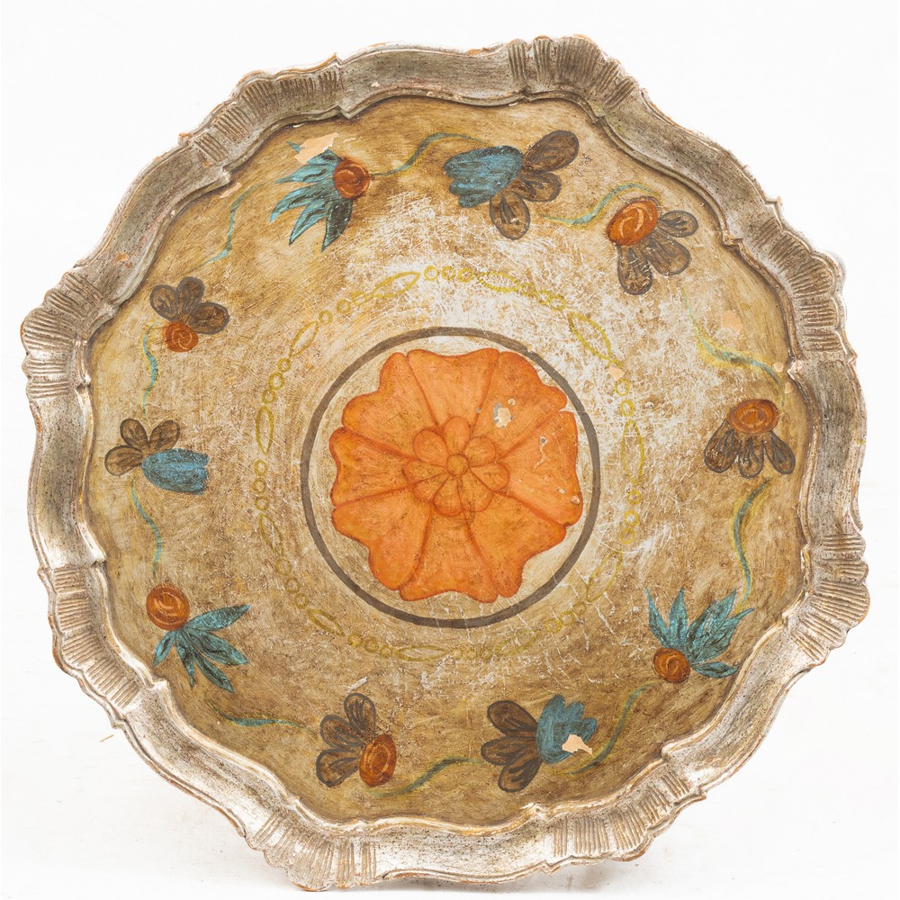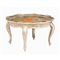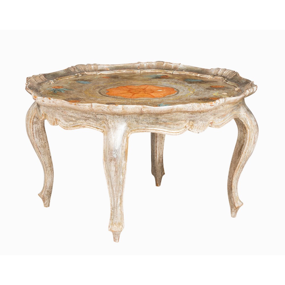 Tavolino da salotto di forma sagomata in legno argentato con decori a mano.