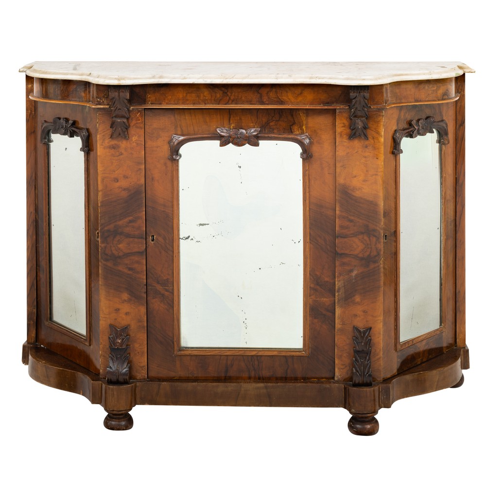 Etagere a tre ante in legno di noce e radica di noce, piano in marmo bianco.