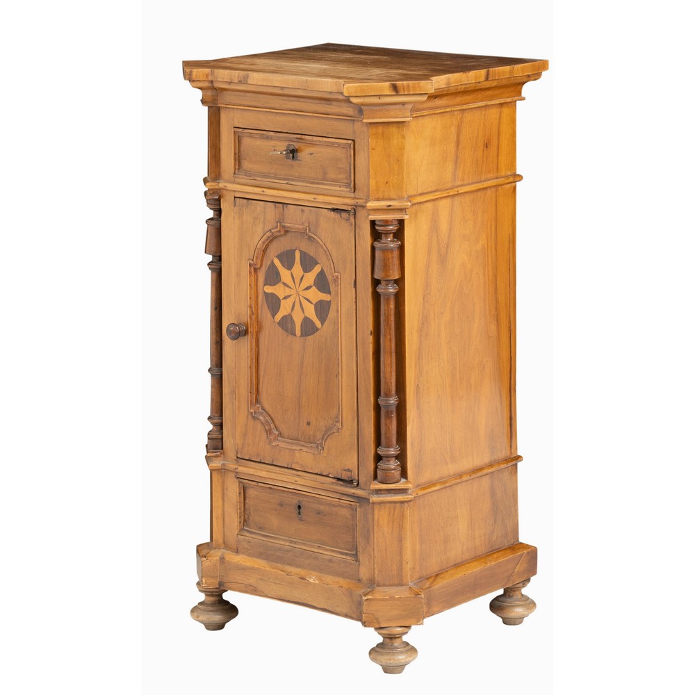 Comodino ad un'anta con due cassetti in legno di noce e tarsie in bosso.