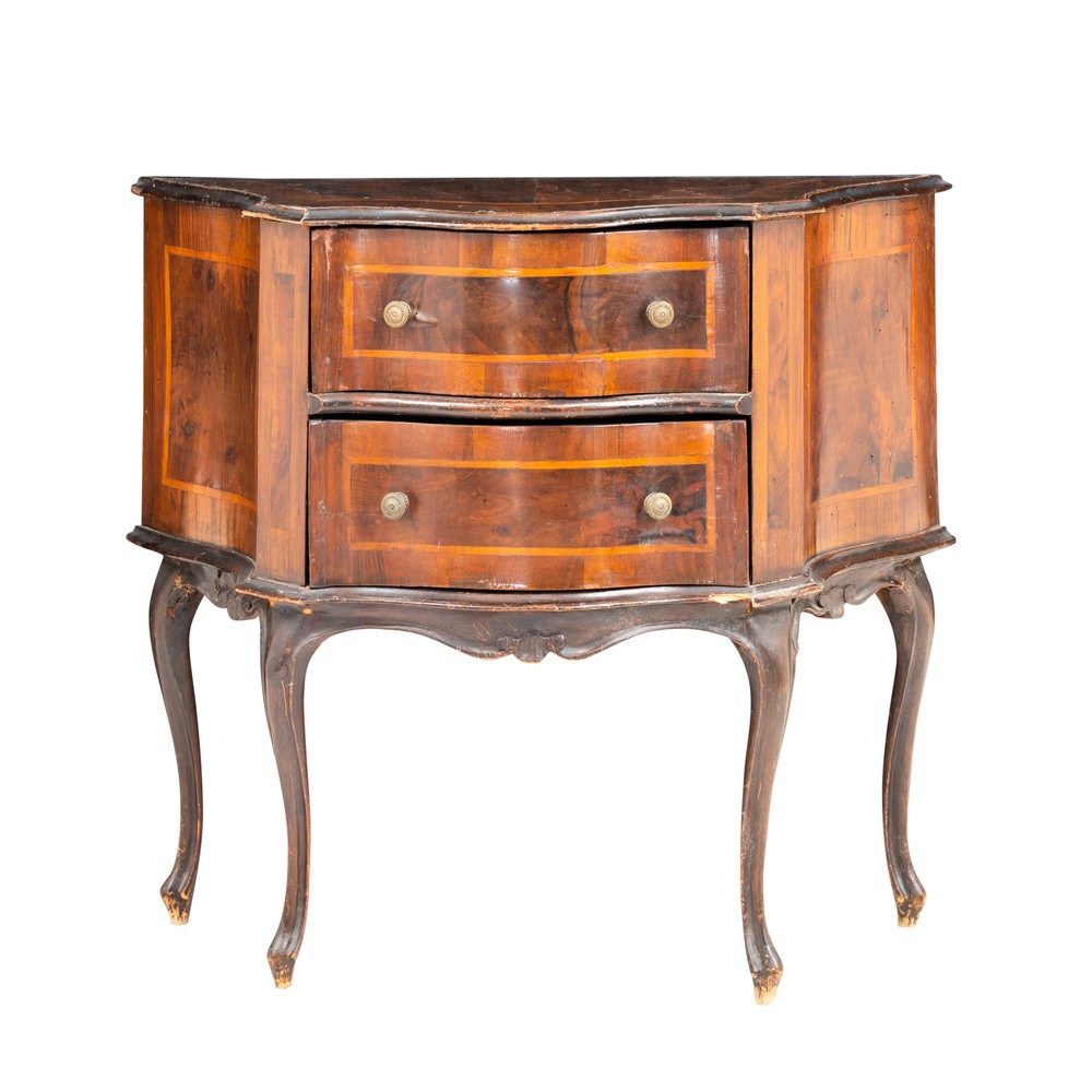 Piccolo cassettone di gusto barocco a due cassetti in legno di noce.
