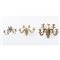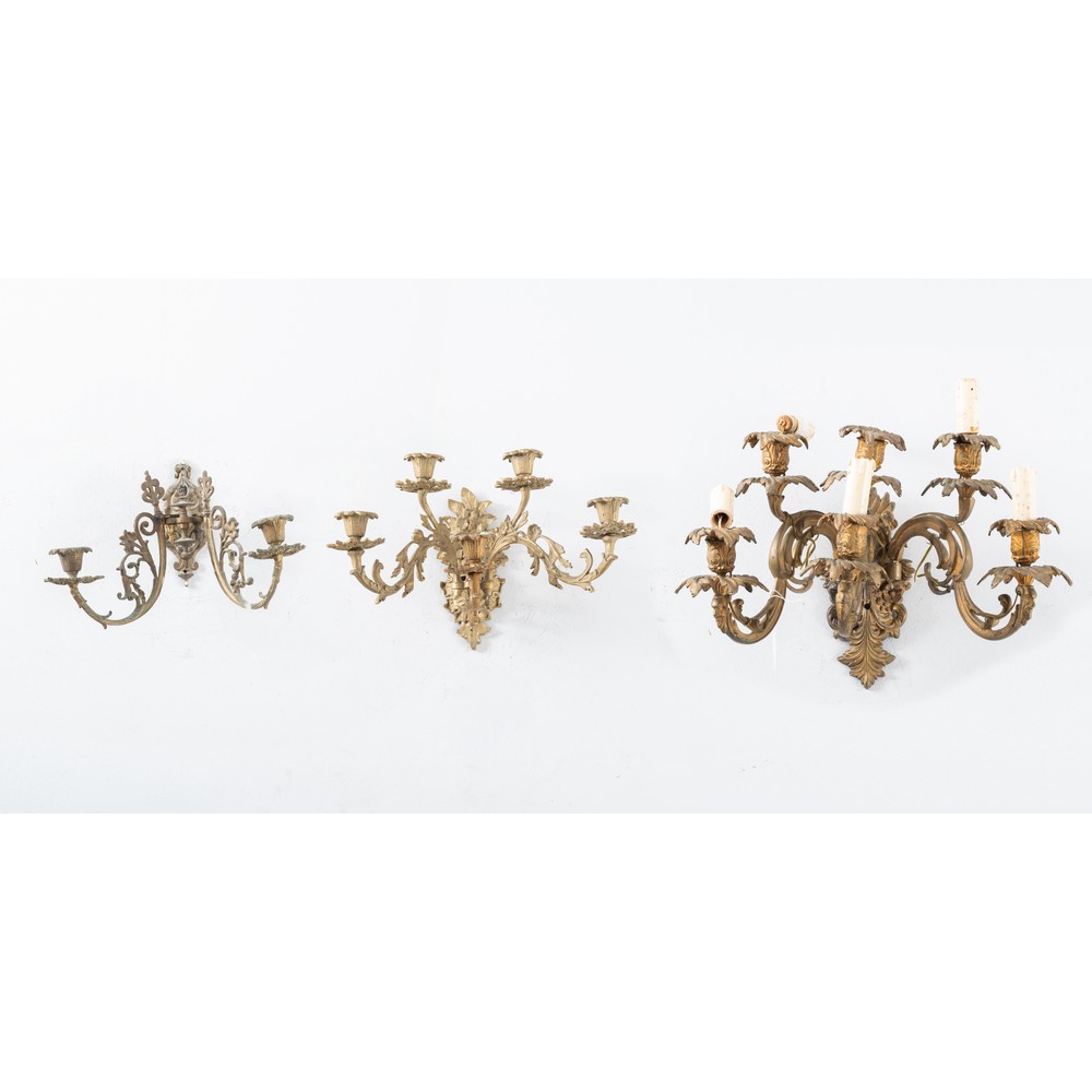Tre applique in bronzo dorato di cui uno a due fiamme, uno a cinque fiamme ed uno a sei fiamme.