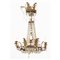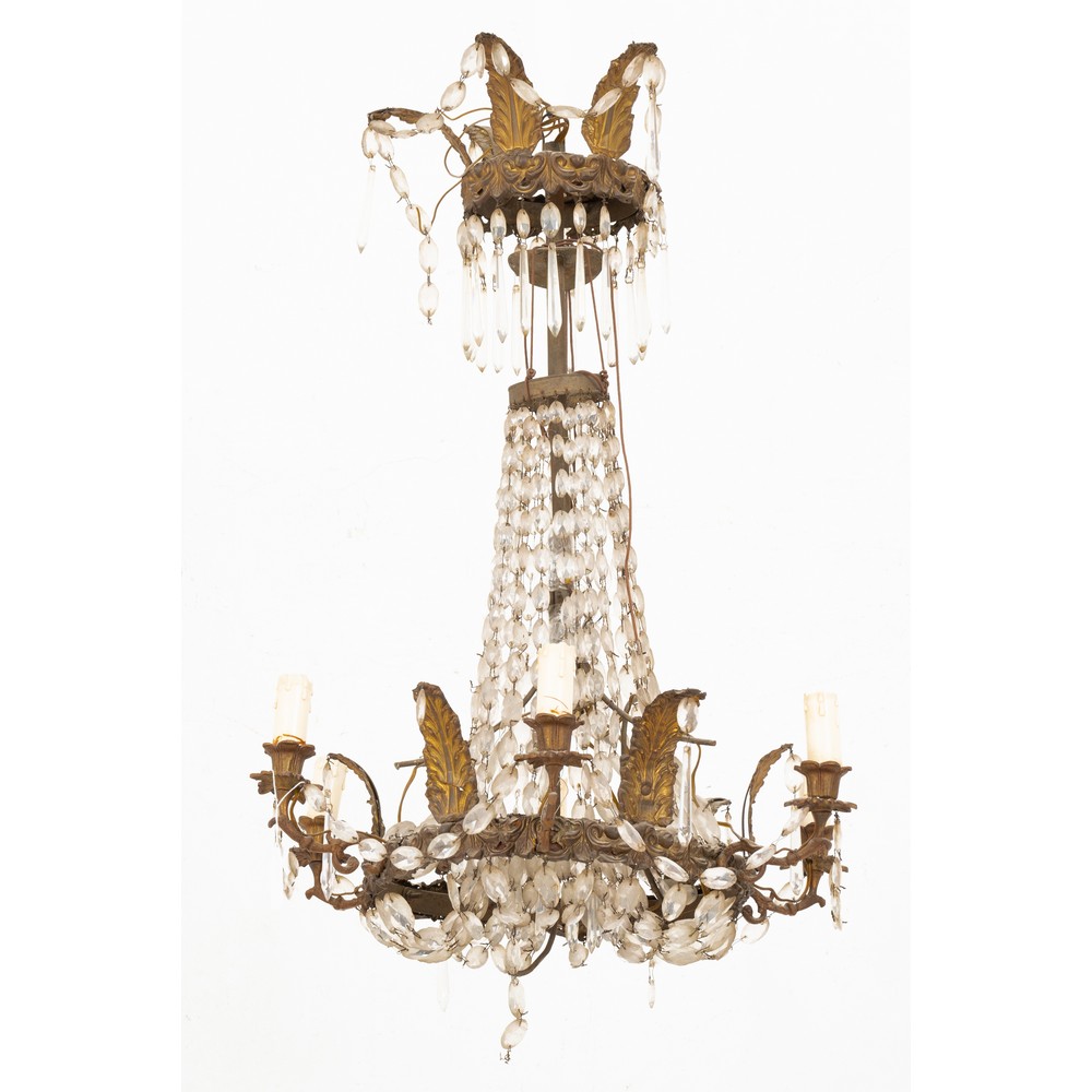 Lampadario a ninfa a sei luci in ottone sbalzato e pendenti.
