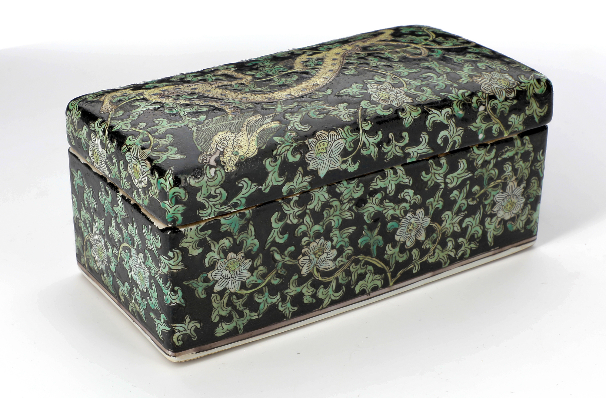 Cina. XX secolo Cofanetto con coperchio con decoro di drago tra fiori di loto