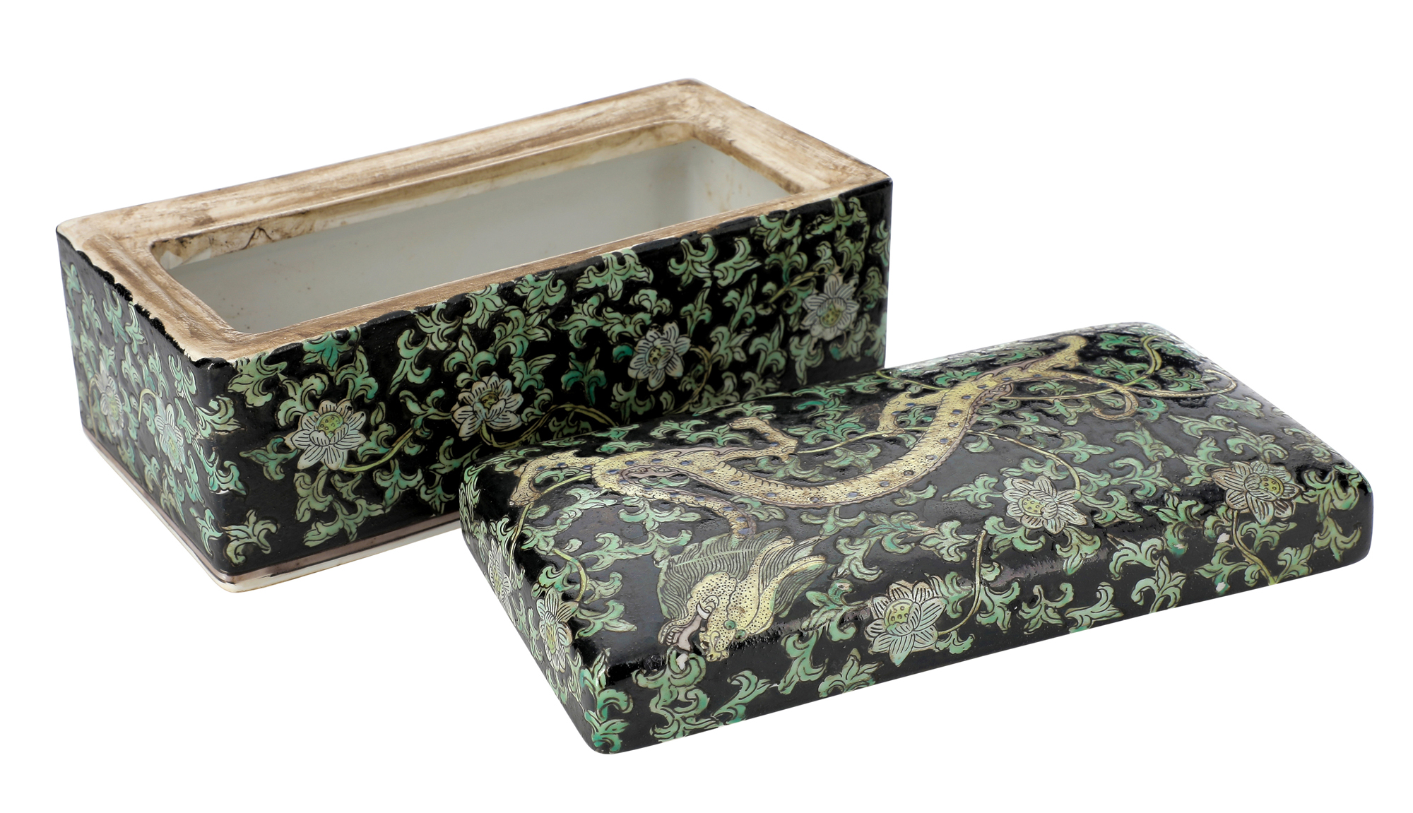 Cofanetto con coperchio con decoro di drago tra fiori di loto