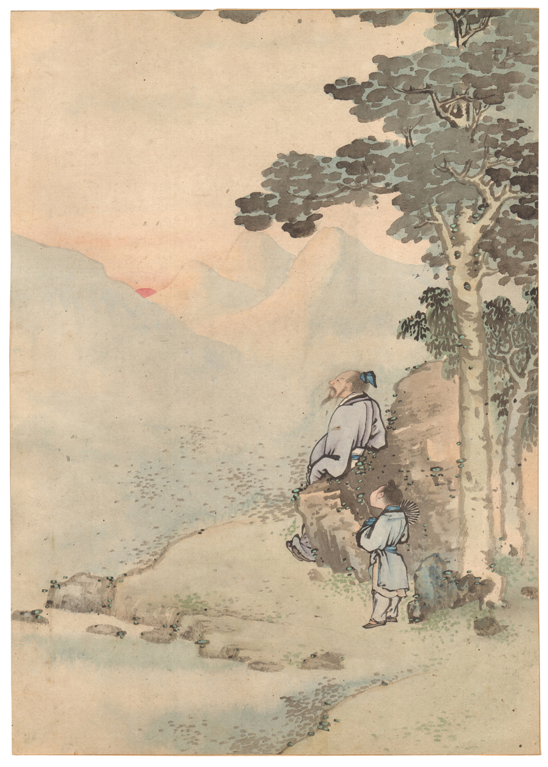 Il disegno esemplifica un soggetto tradizionale della pittura cinese. Mentre il maestro contempla il paesaggio, l’assistente contempla il suo maestro.