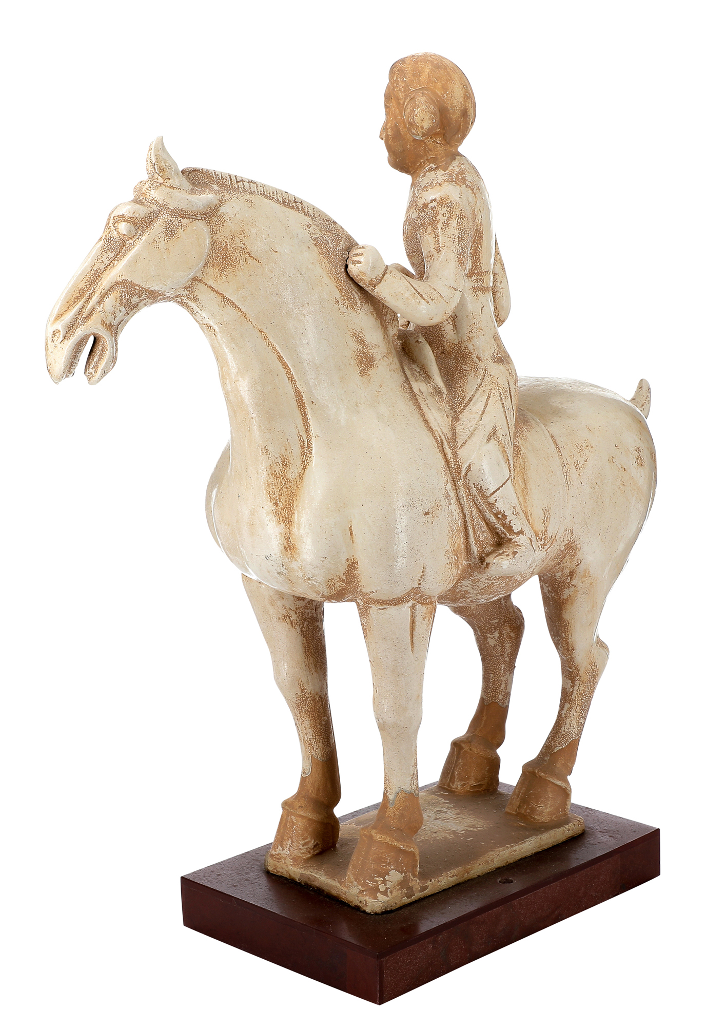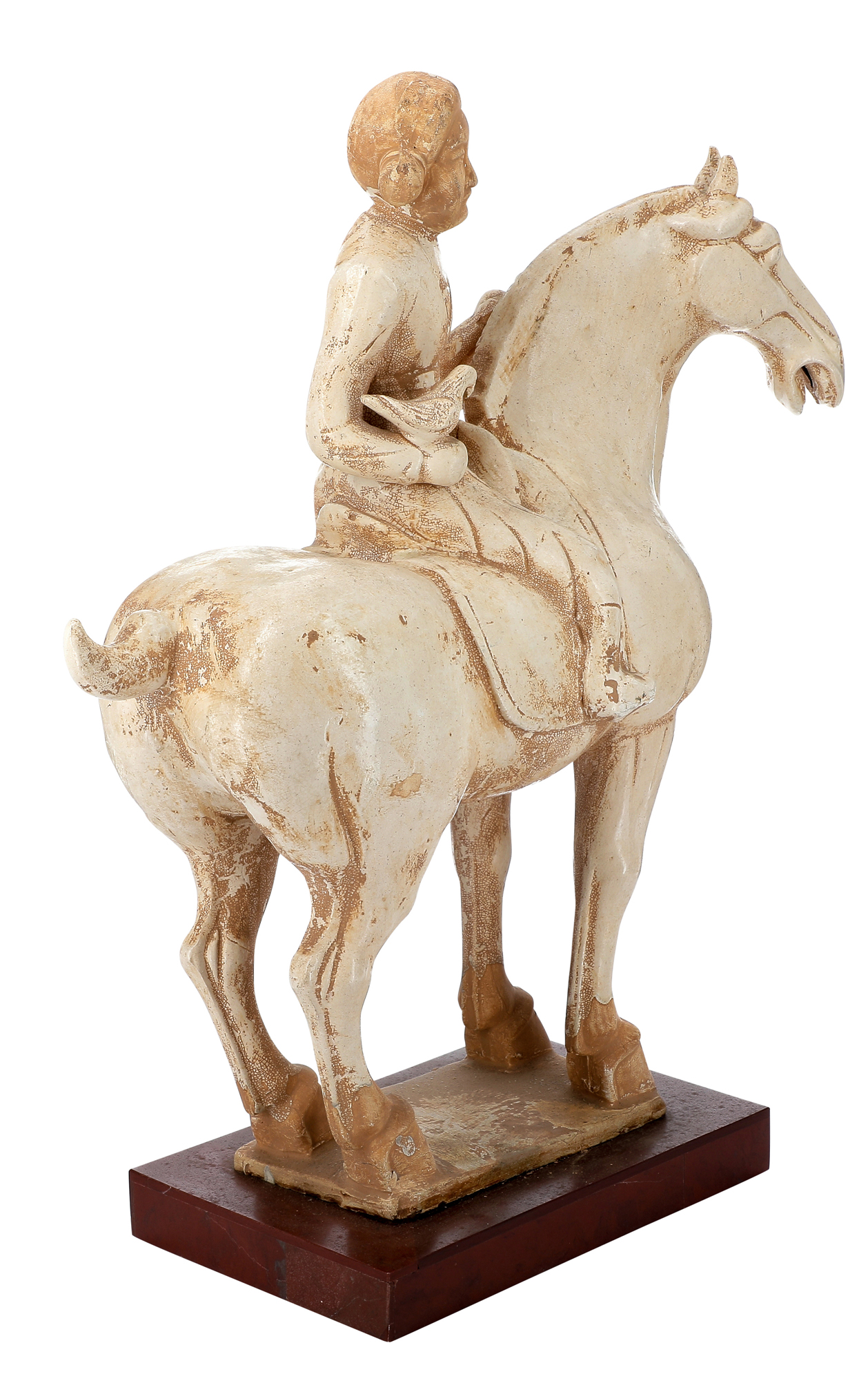 Amazzone con falco in terracotta caolinica con sottile vetrina, il lotto segue le movenze dello stile Tang del VII secolo. Come segnala Roberto Ciarla in base all'esame di foto ad alta definizione, le incrostazioni marroni e la crettatura a maglie molto nette e regolari suggeriscono che si tratti di una replica moderna, realizzata nel XX secolo (comunicazione del 2 novembre 2021).