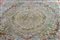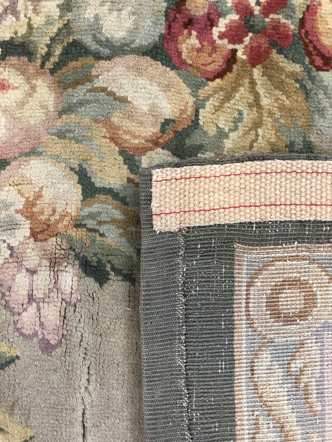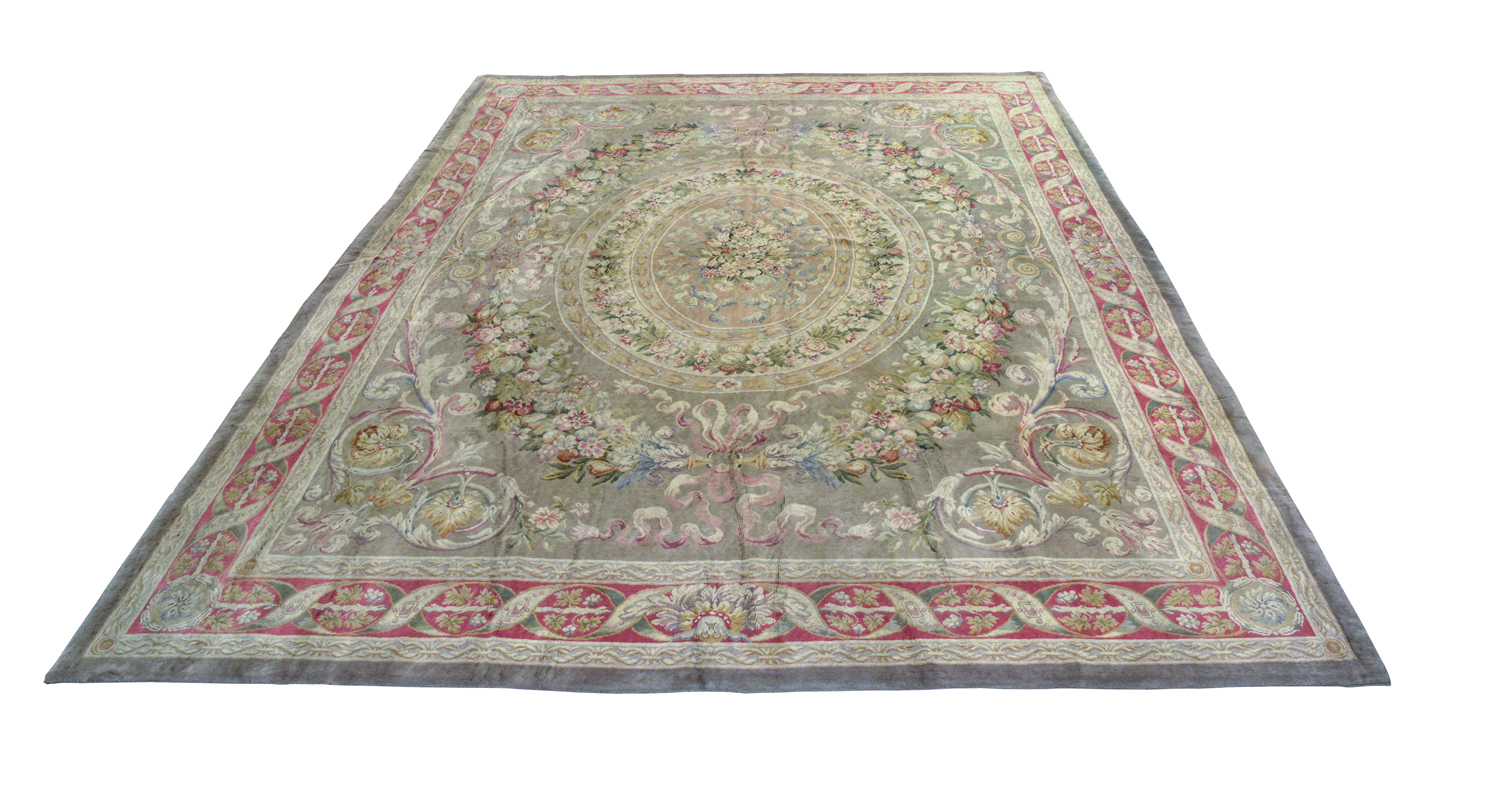 Tappeto in stile francese, con richiamo alla produzione del tardo Ottocento, ma realizzato dopo il 1950. Motivo centrale a medaglioni concentrici, circondati da ghirlande di fiori su fondo color beige. Bordura a fondo rosso chiaro con nastri intrecciati.