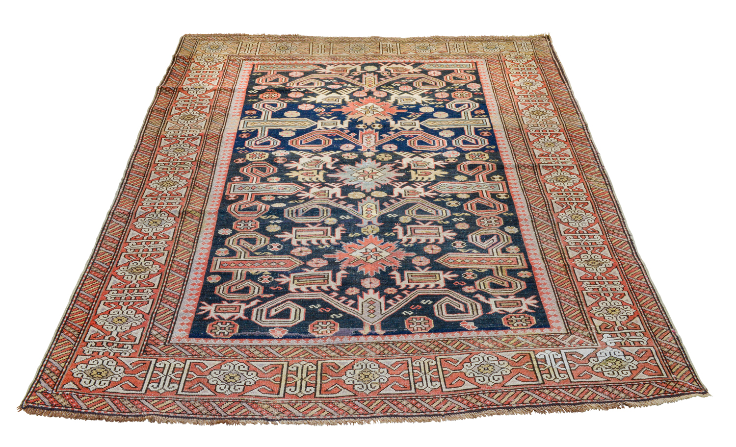Classico esemplare con disegno a corna di montone su fondo blu e bordura pseudo cufica a fondo rosso, contraddistinta da un evidente abrash nella parte alta.