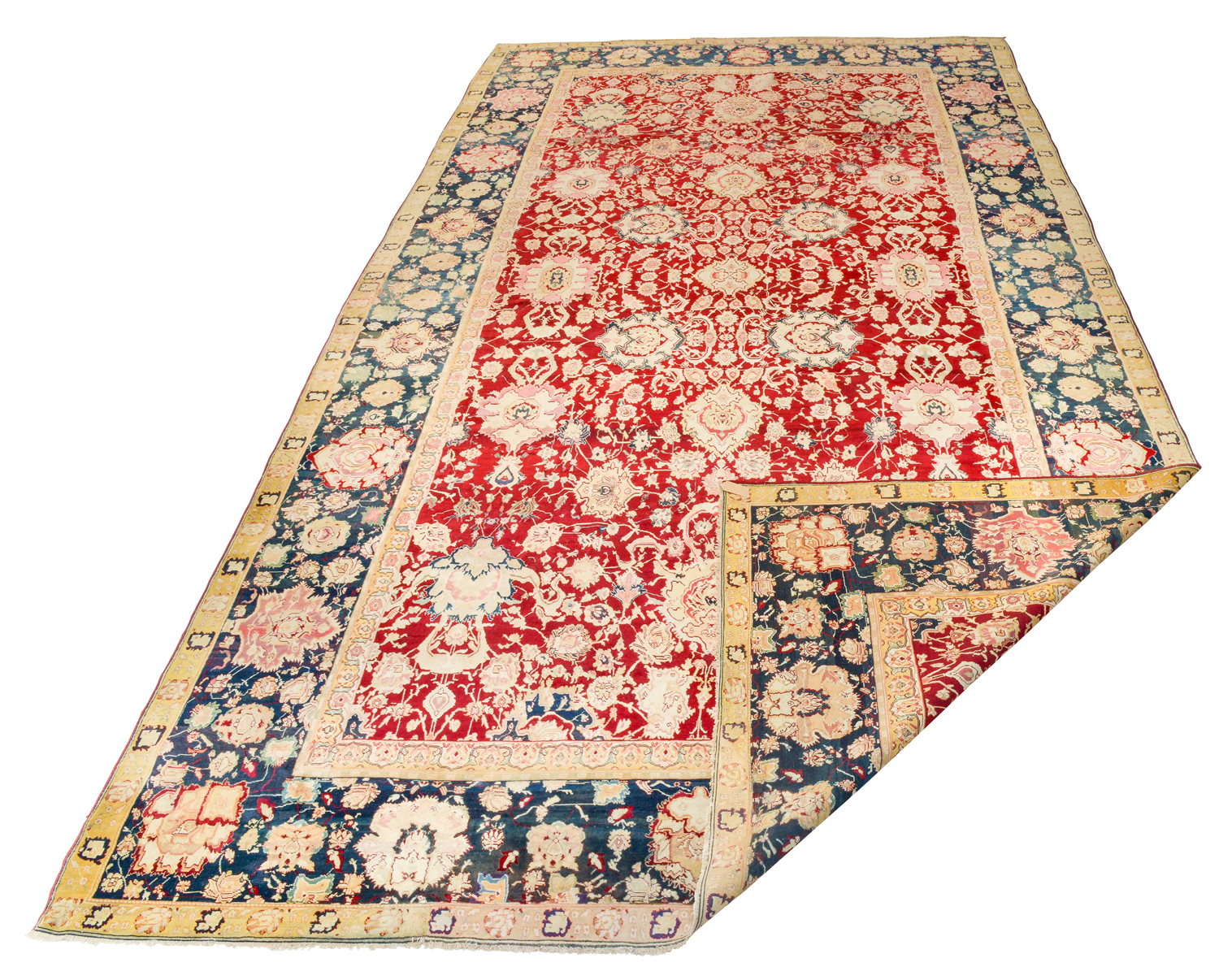 Classico tappeto a palmette e nastri su fondo rosso, di enormi dimensioni. Bordura a fondo verde. Particolarmente fine di tessitura.