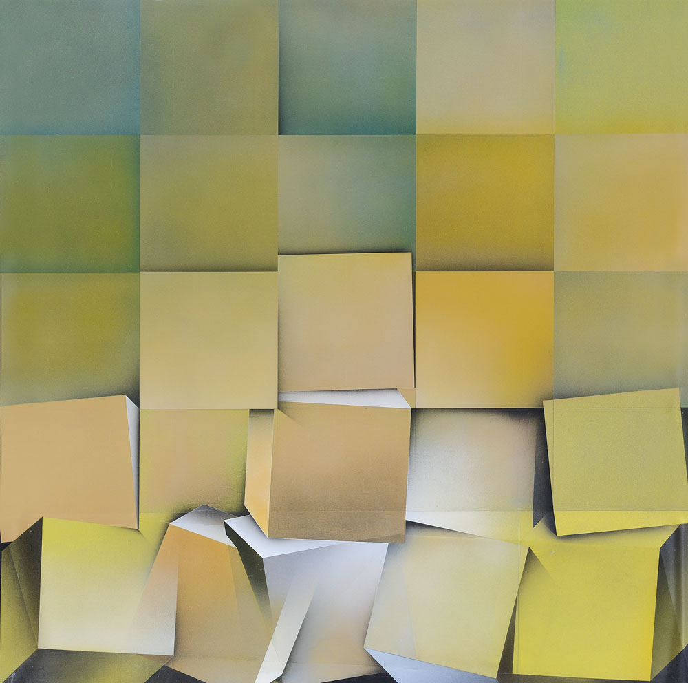 nitroacrilico su tavola cm. 80x80, firma, anno e tecnica al retro, entro teca in plexiglass.