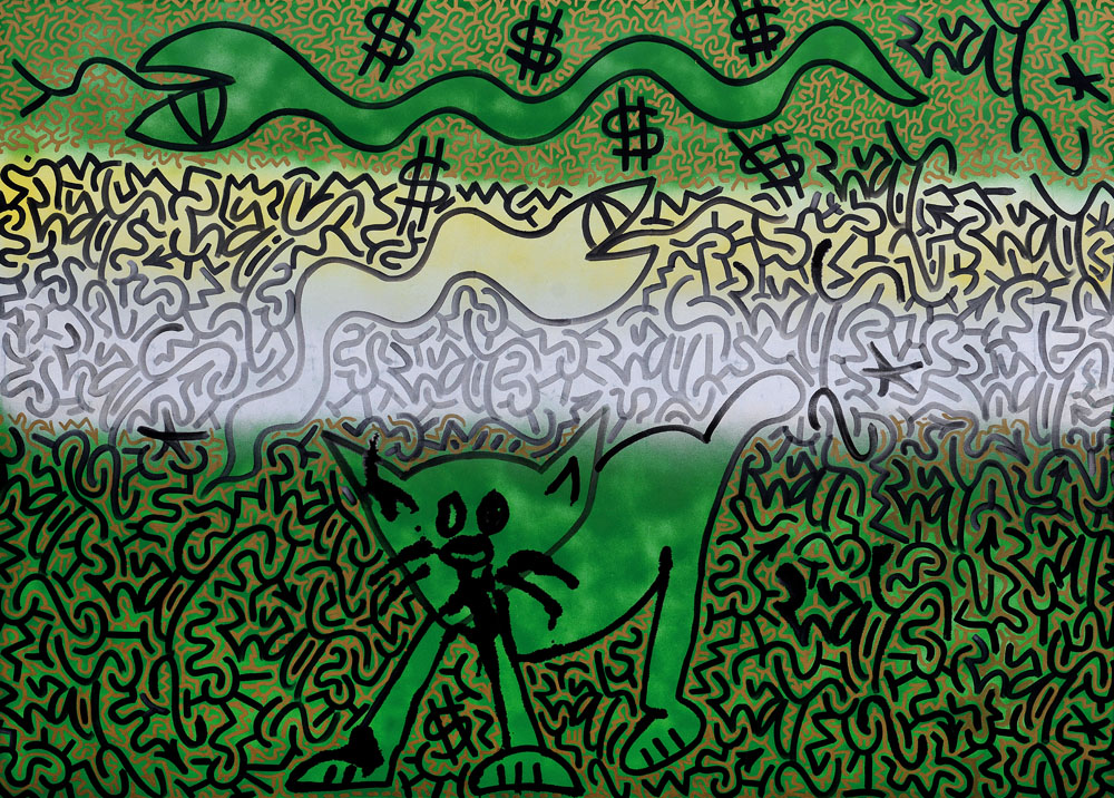 acrilici e smalti su tela cm. 152x200, firma al retro, dichiarazione d'autenticità dell'artista su certificato della Follin Gallery (New York) allegato; opera priva di telaio e cornice.