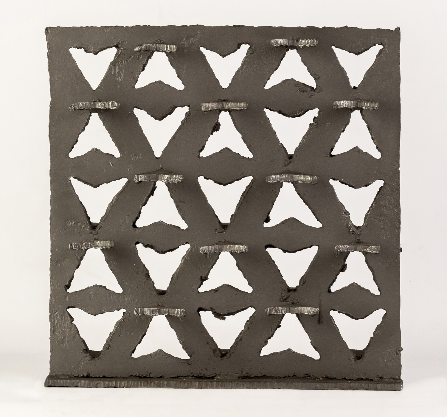 Si tratta del bozzetto pensato per il portale della chiesa di San Paolo, a Vicenza. Benetton voleva che la luce potesse entrare dal portale anche quando era chiuso. Perciò pensò di tagliare la lastra riprendendo la forma delle spine. Tuttavia, in fase realizzativa, le punte sporgenti verso l'esterno vennero considerate pericolose e quindi sostituite con tagli rettangolari, verticali. Giovanni Benetton ha rinvenuto nell'officina paterna alcuni calcoli matematici che mostrano le complesse riflessioni di Benetton prima della traduzione del pensiero in immagini definitive. Nel nostro bozzetto, che ha una spiccata struttura modulare, balza all'occhio la disposiozione degli elementi cinque per lato.