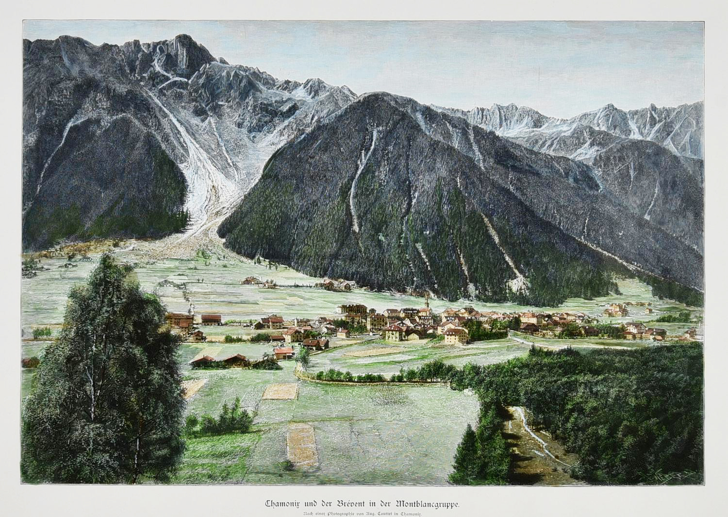 CHAMONIX UND DER BREVENT IN DER MONTBLANCGRUPPE, 1890 litografia con...